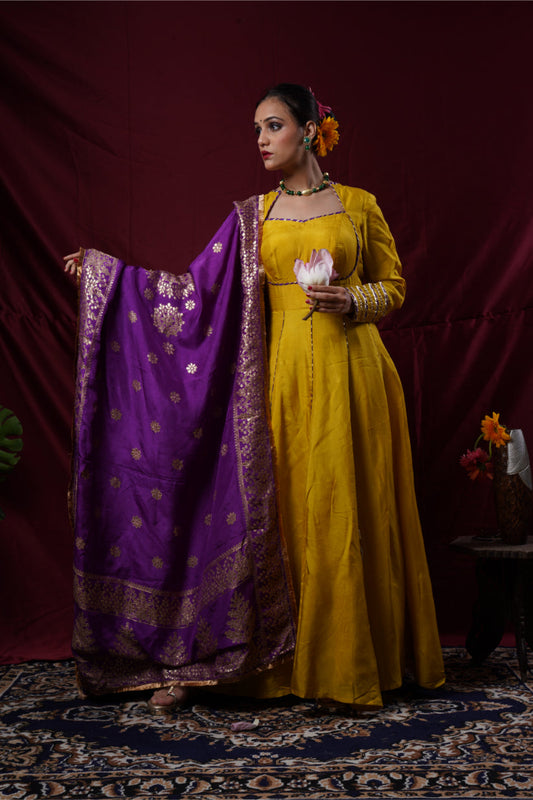 A mustard yellow anarkali gown