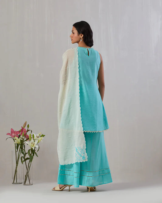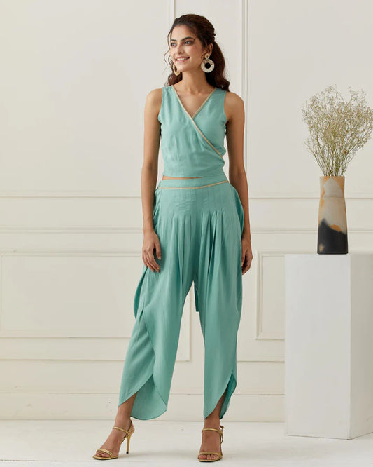 3 Piece Sea Cami & Dhoti Pant Set with Chanderi Printed Jacket