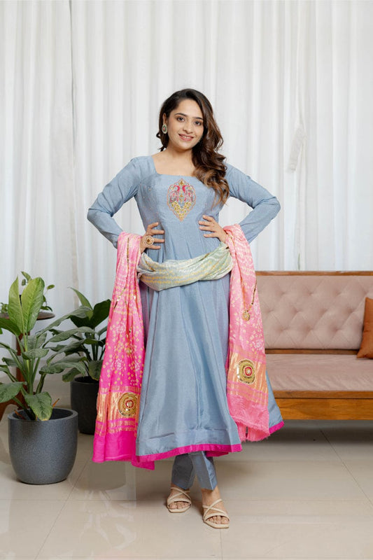 "Noor-E-Bahar" – Grey Anarkali with Bandhani Bliss