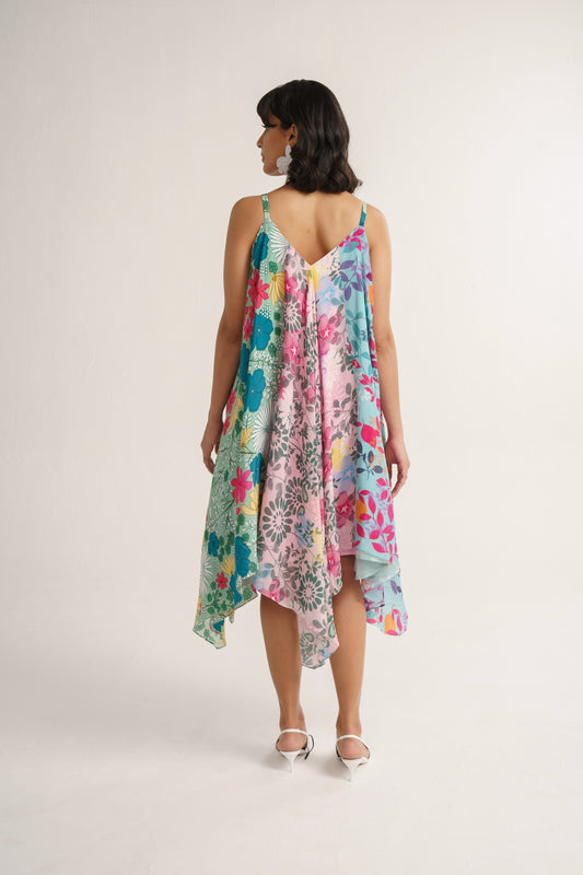 Multi Color Crepe Silk Print Floral V Neck Lotus Garden Patch Dress