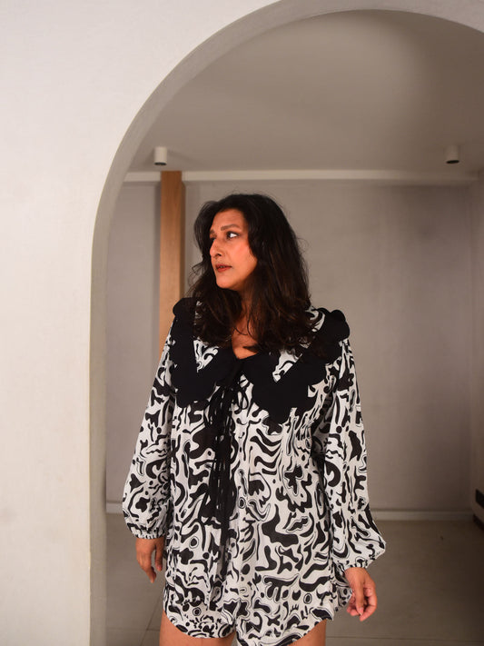 White Crepe Silk Print Abstract Floral V Tie-up Daisy Dress