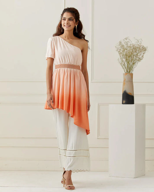 Off Shoulder Ombrey Kurta with Scalloped Pant