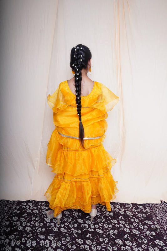 Mustard Cape Sleeves Lehenga Set