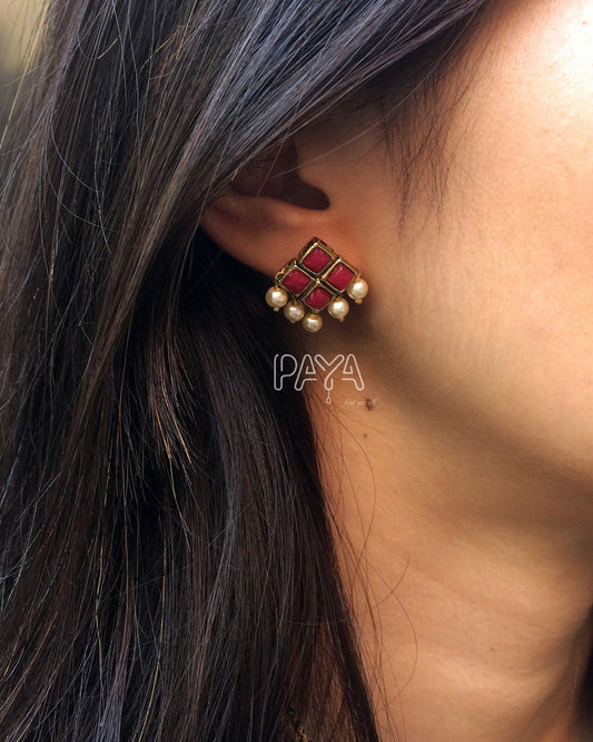 Red Resin Stone and Pearl Stud Earrings