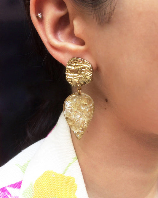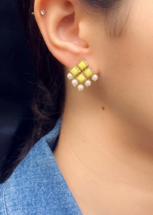 Yellow Resin Stone and Pearl Stud Earrings