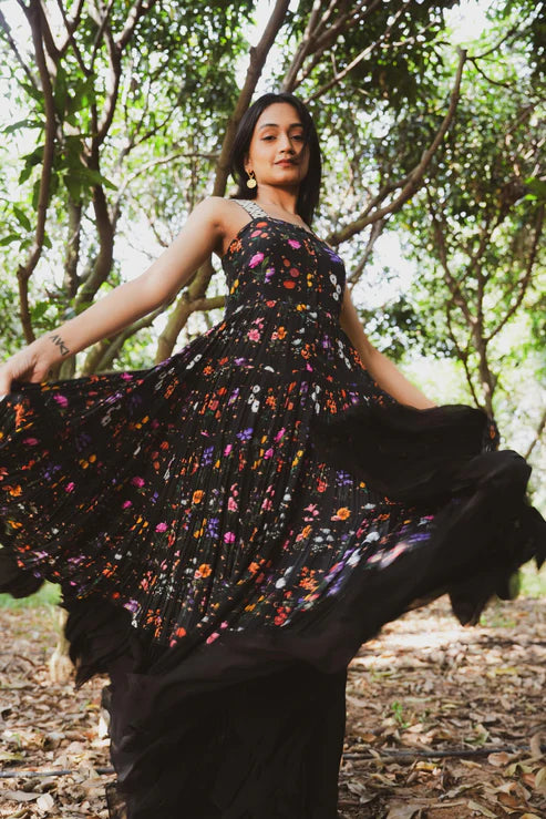 BLACK ABSTRACT LONG INDO LEHENGA DRESS