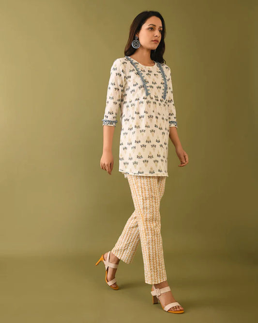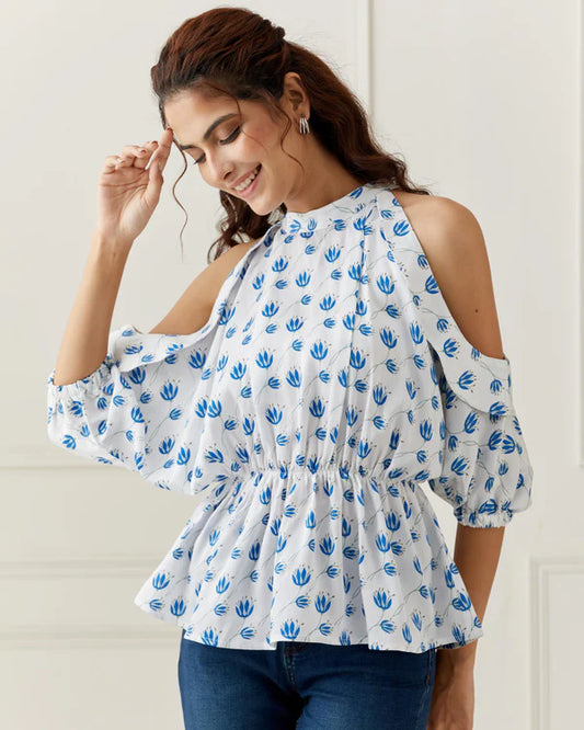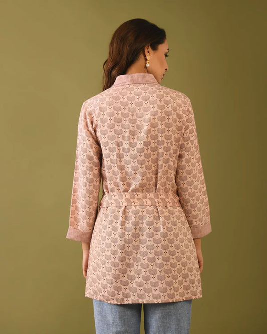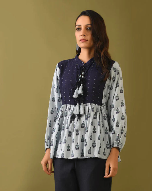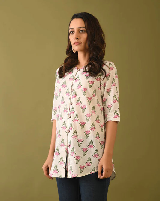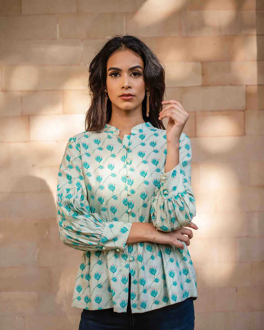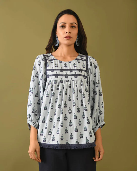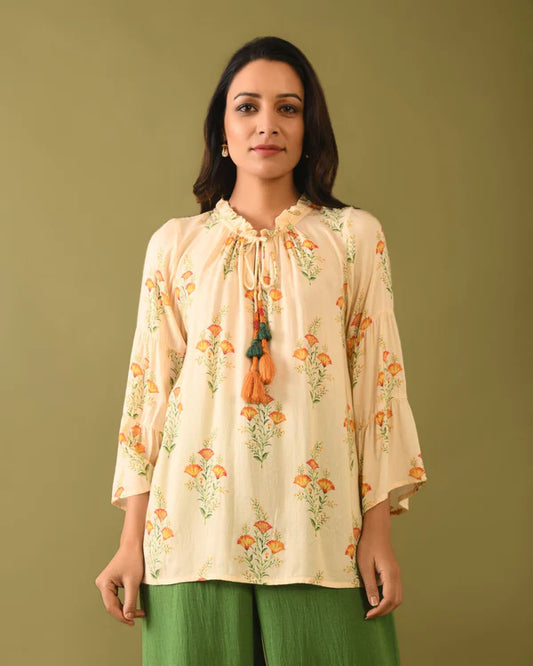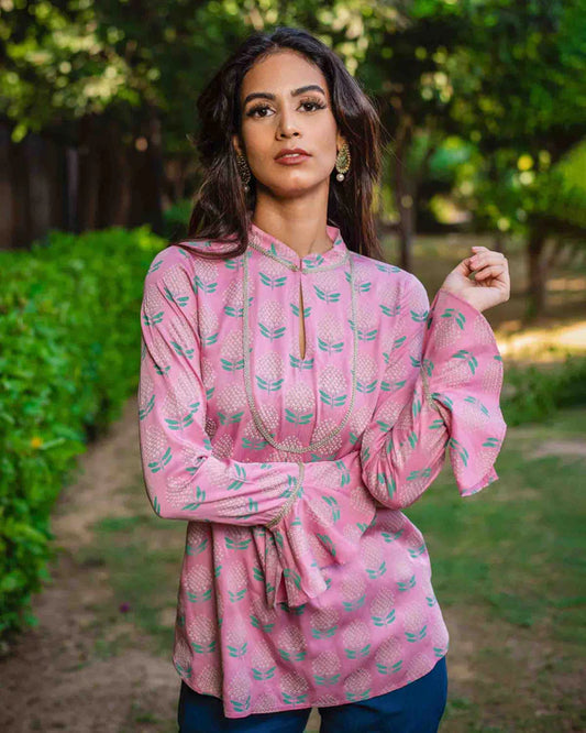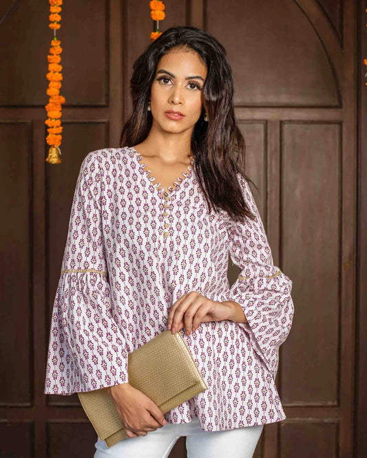 Blush Hand Block Print Modal Satin Bell Sleeve Top