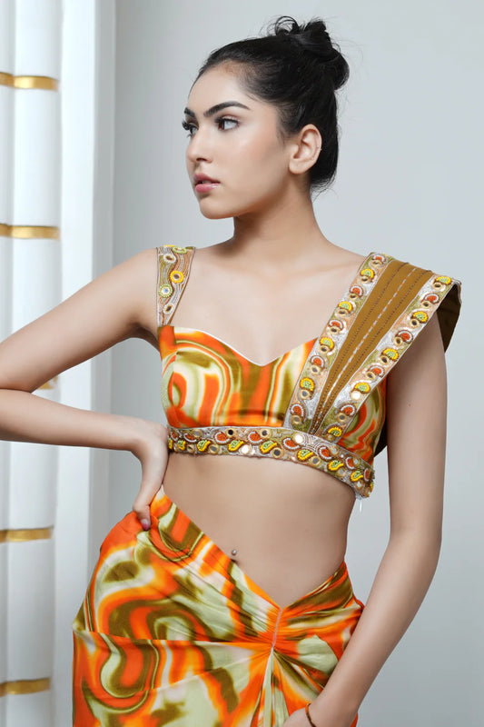 ORANGE MULTICOLOR ABSTRACT DRAPE SKIRT SET (SET OF 2)