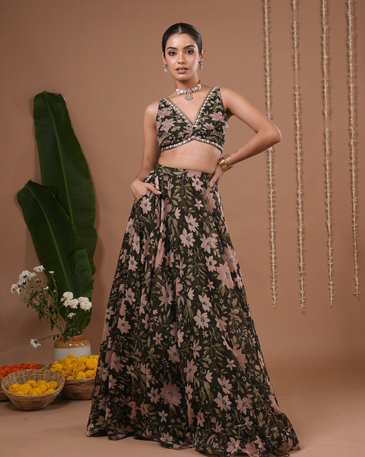 Olive Green Floral Printed Organza Lehenga Set (Set of 3)