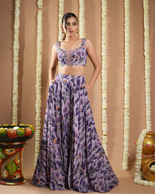 Violet-Lilac Printed Indo Lehenga Set (Set Of 2)