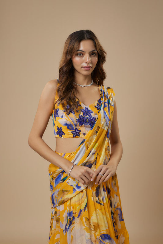 Green Crepe Silk Print Floral Scoop Neck Angelica Saree With Blouse