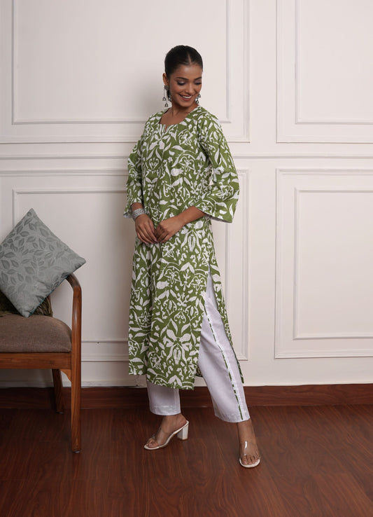 JANHAVI IN CREAM AND GREEN LINEN KURTA SET
