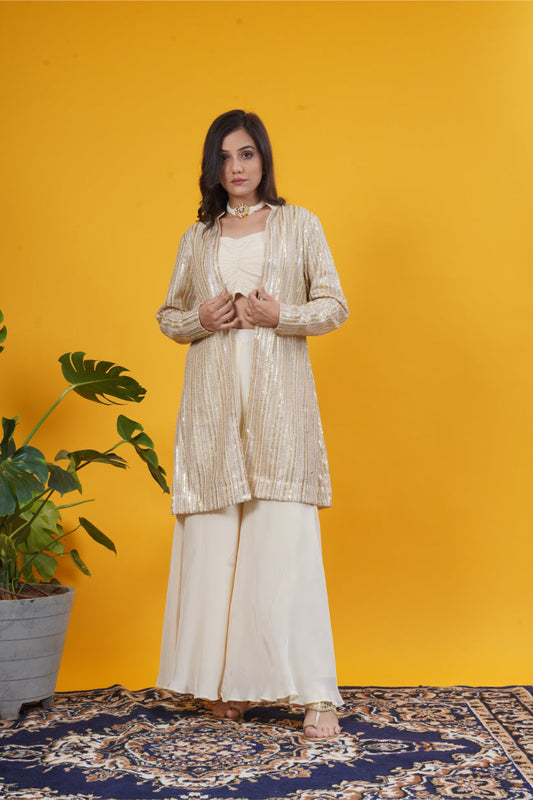 Ivory Gold Sequin Embellished Crepe Jacket Set