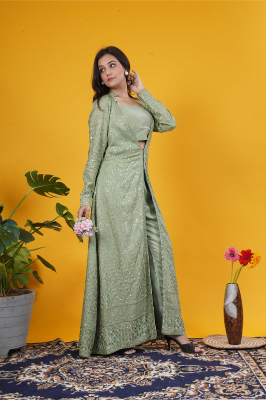 Olive Green Mirror Work Upada Silk Long Jacket Set with blouse and tailored pants