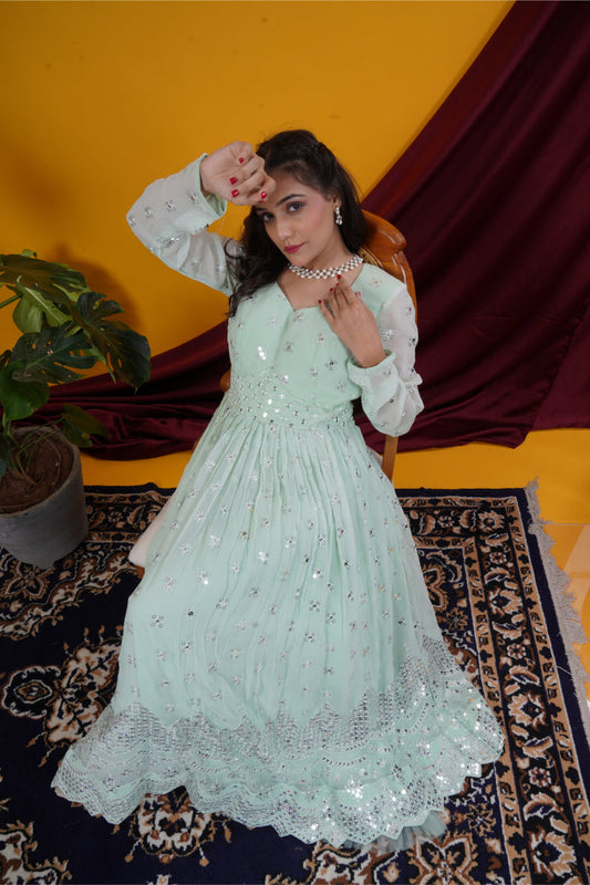 Pista Green Mirror Work Double Yoke Gown Set