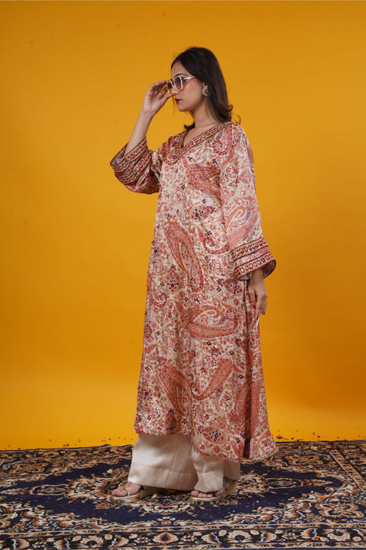 An ivory paisley print suit set with handwork