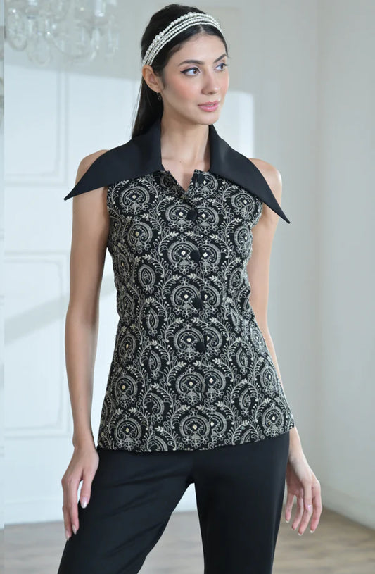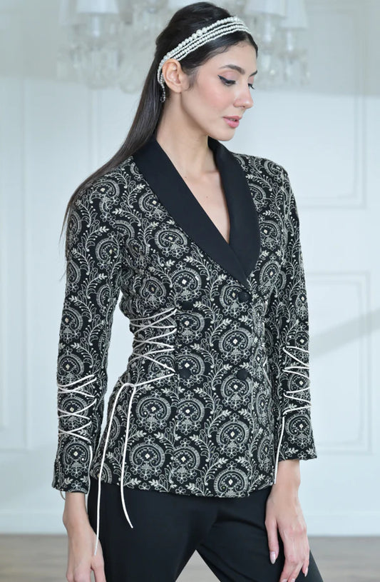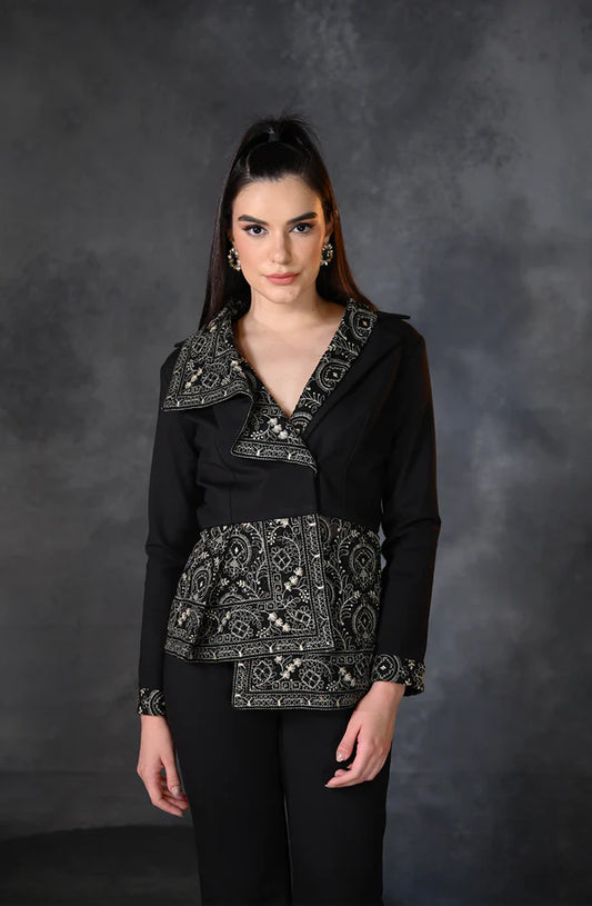 Black Golden Asymmetrical Drape Blazer Pant Set
