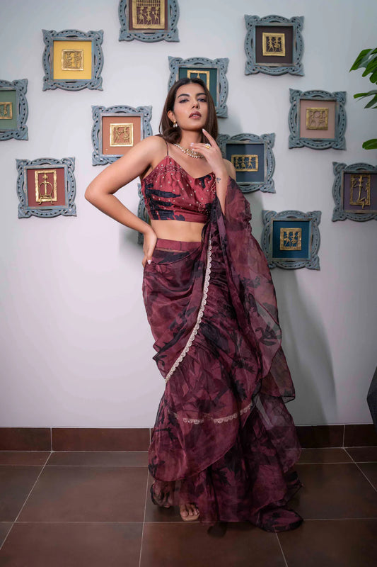 shades of wine- ruffle saree