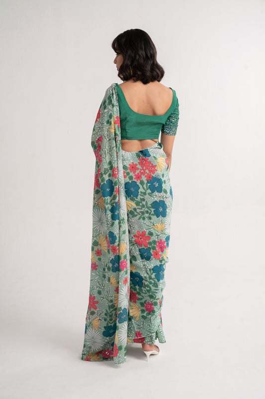 Green Crepe Silk Print Floral V Neck Hellebores Garden Saree Wit Blouse
