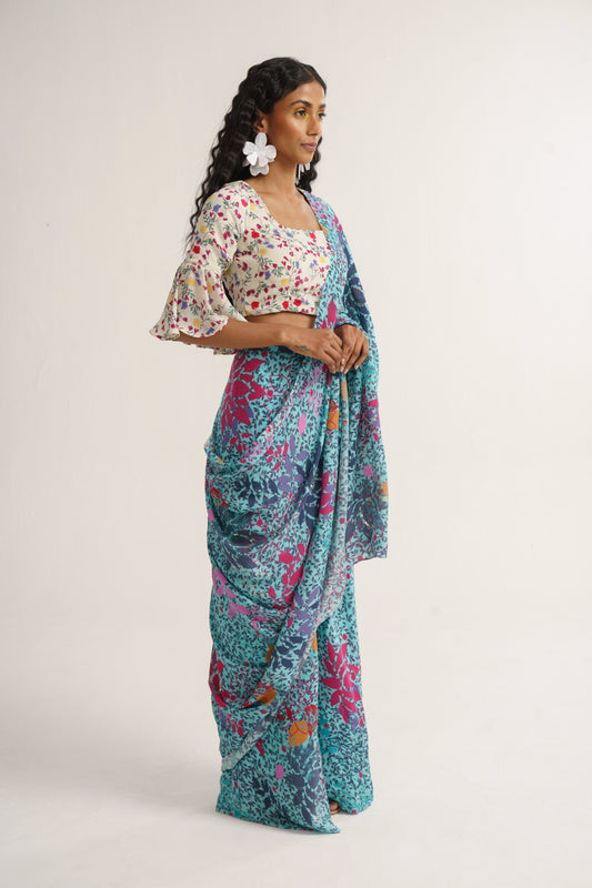 Blue Crepe Silk Print Floral Square Neck Lupine Pre-stitched Saree With Blouse
