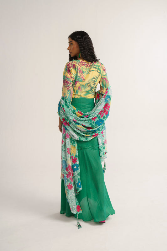 Yellow Crepe Silk Print Tropical V Neck Allamanda Top Skirt Set