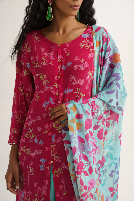 Pink Crepe Silk Print Periwinkle Round Neck Kurta Pant Set