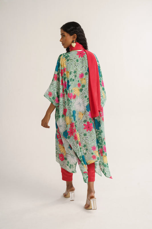 Green Crepe Silk Print Floral Garden V Neck Dianthus Kurta Pant Set