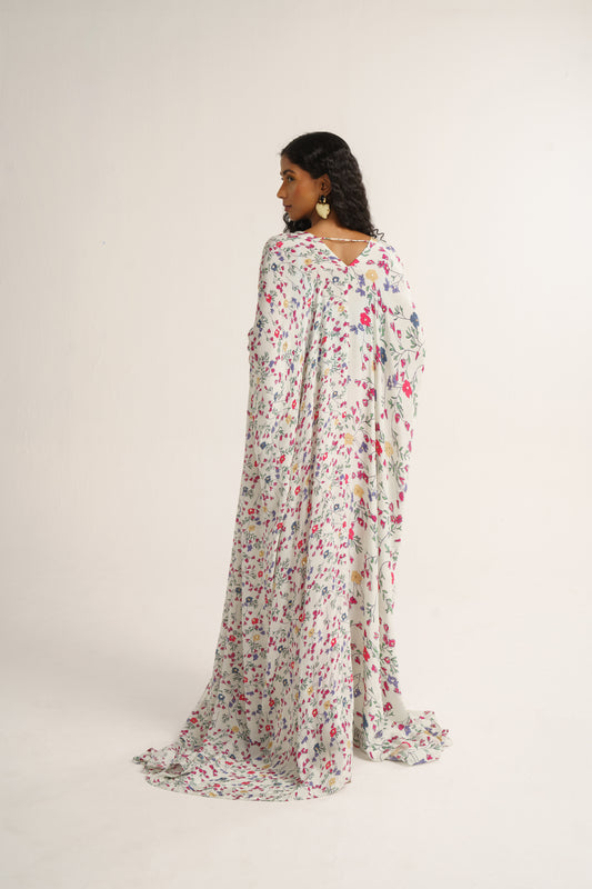 White Crepe Silk Print Floral V Neck Calandiva Cape
