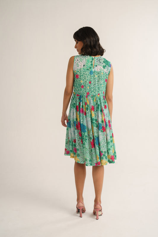 Green Crepe Silk Print Floral Round Neck Iris Dress