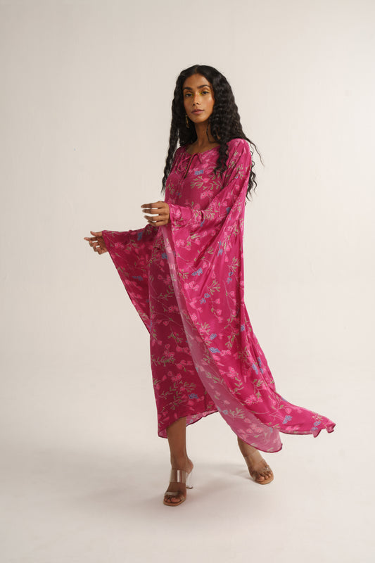 Pink Crepe Silk Print Primrose Round Neck Kaftan