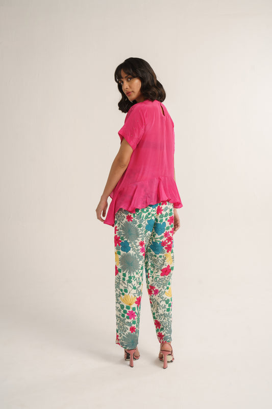 Pink Crepe Silk Print Floral Round Neck Azalea Asymmetric Top With Pant