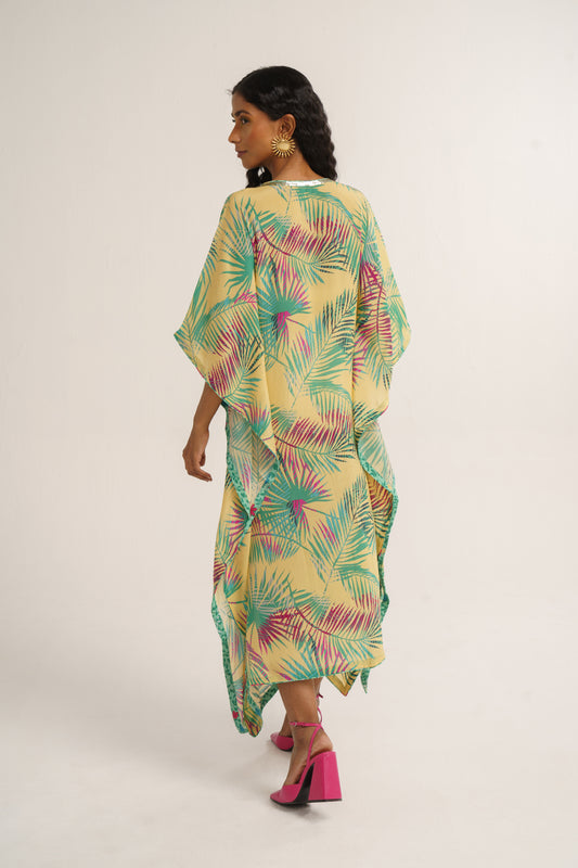 Yellow Crepe Silk Print Tropical V Neck Chrysanthemum Kaftan