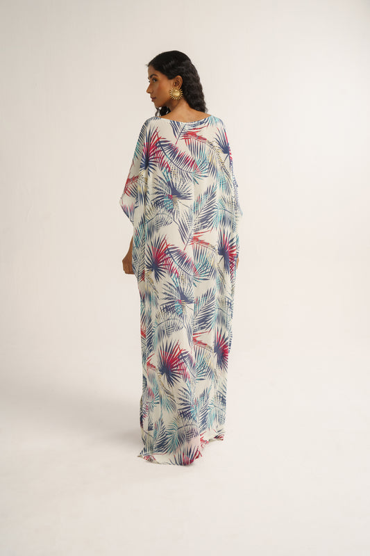 White Crepe Silk Print Tropical Scoop Neck Squill Kaftan