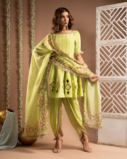 Green Short Anarkali-Tulip Salwar Set (Set of 3)