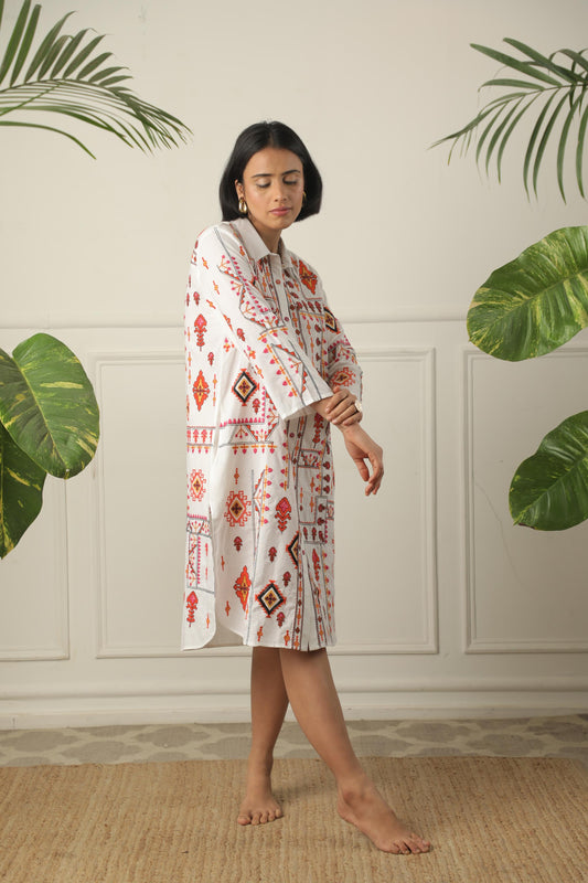 PALM LEAVES ON LIGHT RED MIDI DRESS
