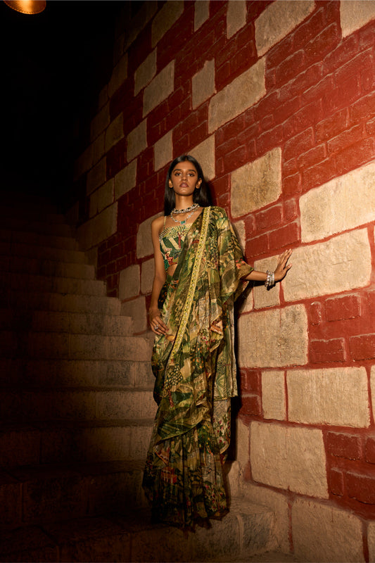 Elephant Print Green Purple Pre-Drape Saree (Set of 2)