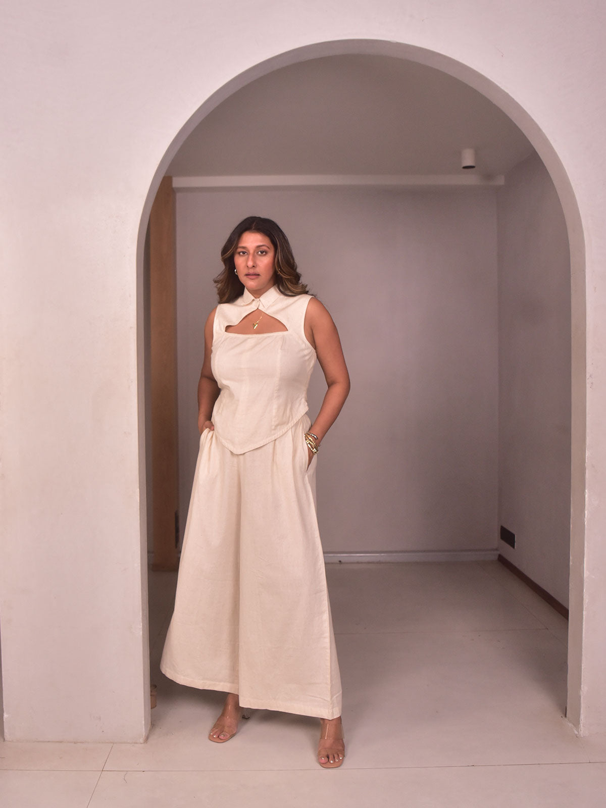Crafted in beige cotton linen, this top has classic collars, a refined neckline cut-out, and a corset-like bodice for a shapely fit. Its structured yet breathable design makes it perfect for brunches or relaxed resort evenings. Pair it with linen trousers or shorts and simple jewelry for an elegant travel-friendly ensemble.