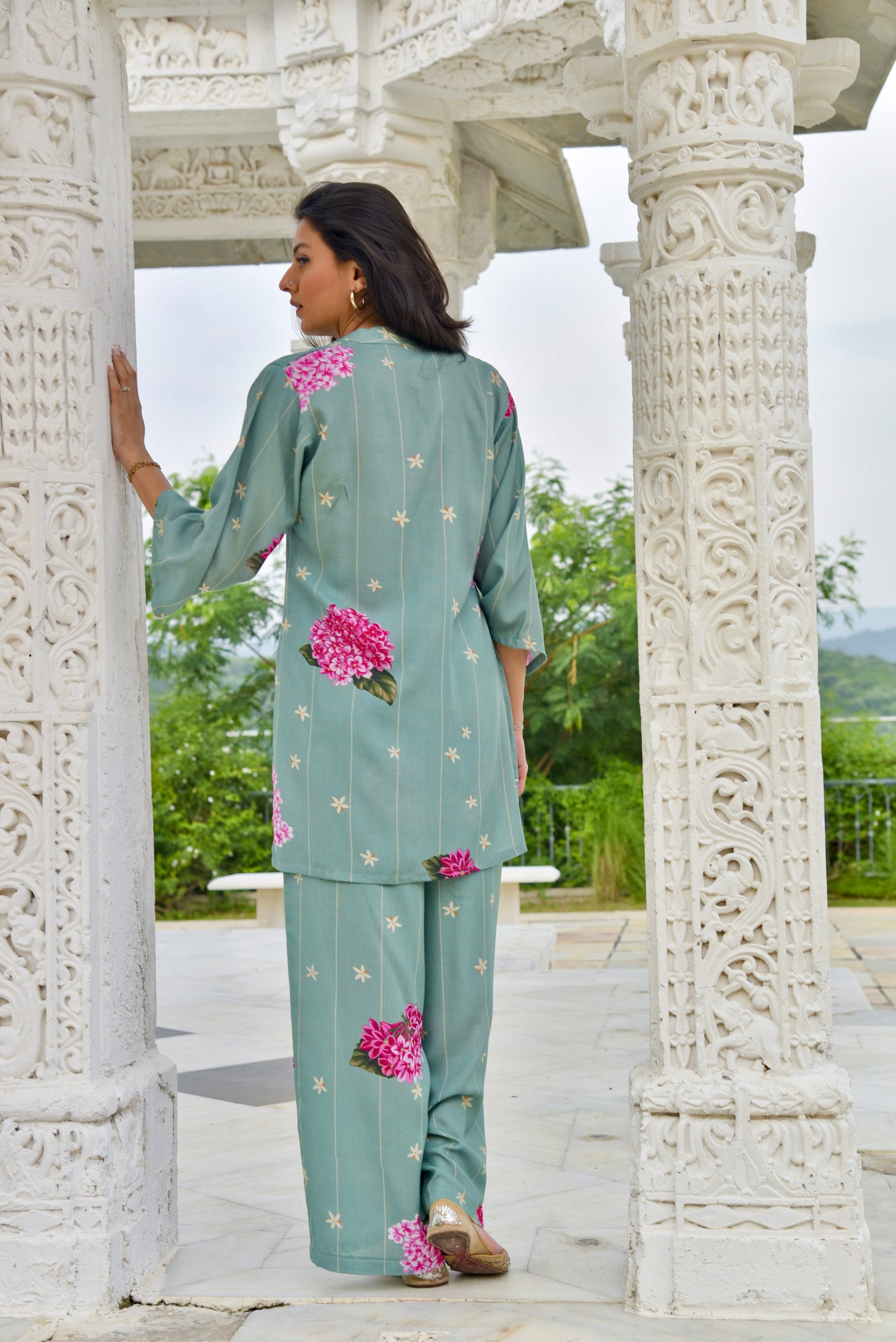 A breezy kurta set crafted for effortless style. The short kurta comes with a chic Chinese collar, flared sleeves for added movement, and delicate button details. Paired with wide-leg pants, it blends comfort with elegance. The pastel base is lifted with bold floral prints, making it perfect for both easy daywear and understated festive dressing.
