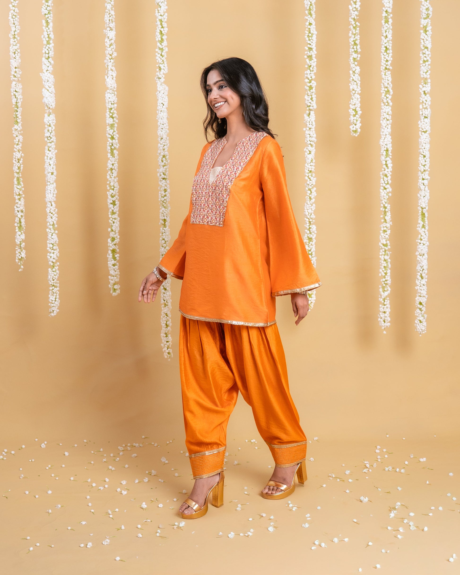 A luminous peach-orange kurta set designed in a relaxed silhouette with flared sleeves and a delicately embroidered yoke paired with farshi pants.Gold lace detailing on the sleeve and pants makes it perfect for festive soirees.