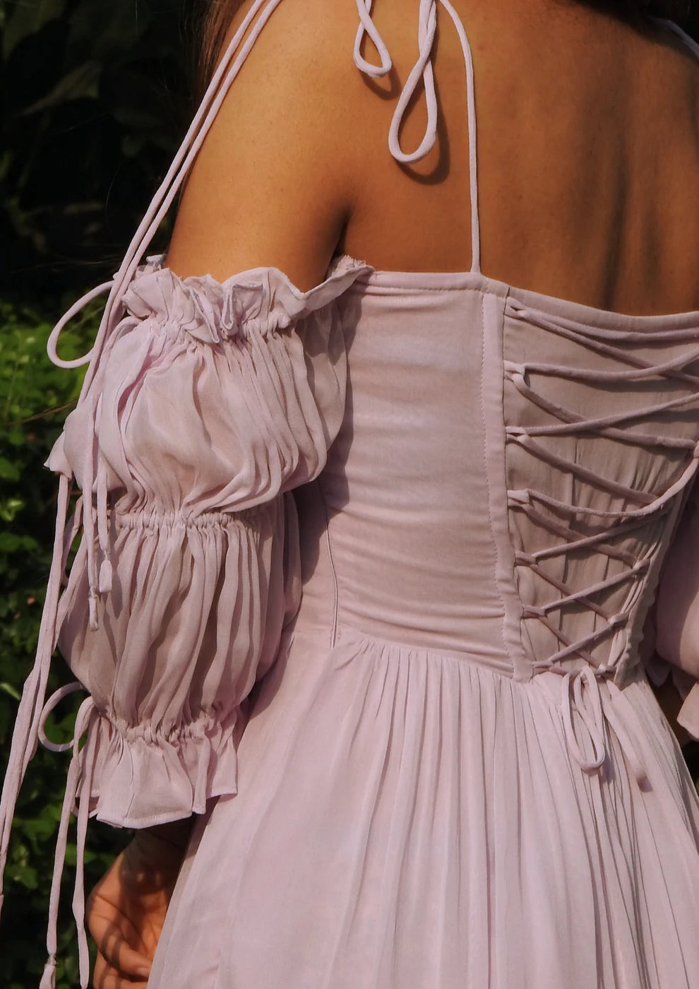 A twilight bloom beneath the sky — this lavender midi dress stuns with puff tier sleeves, a corset bodice, criss-cross back, and a softly frilled slit hem.
