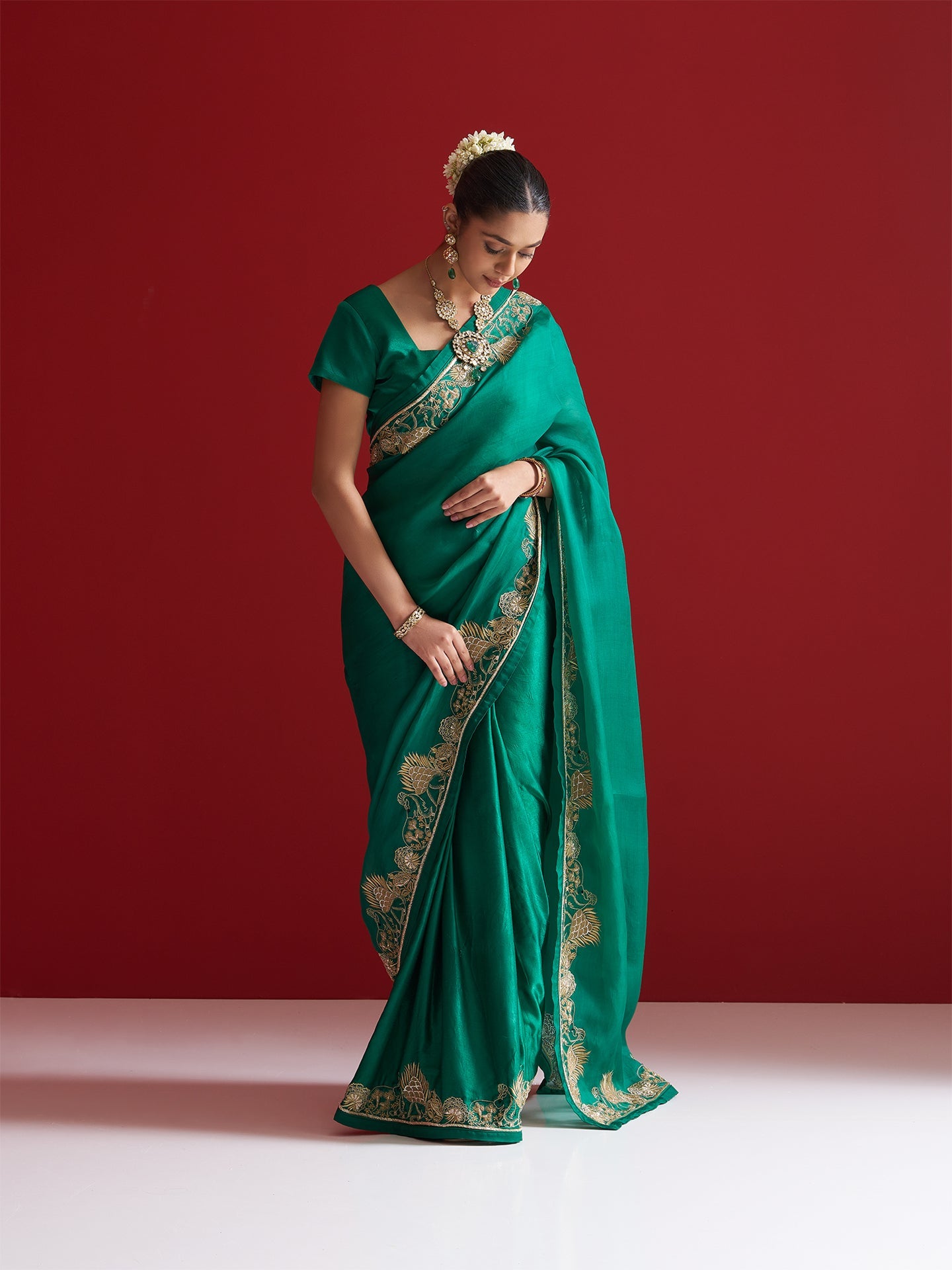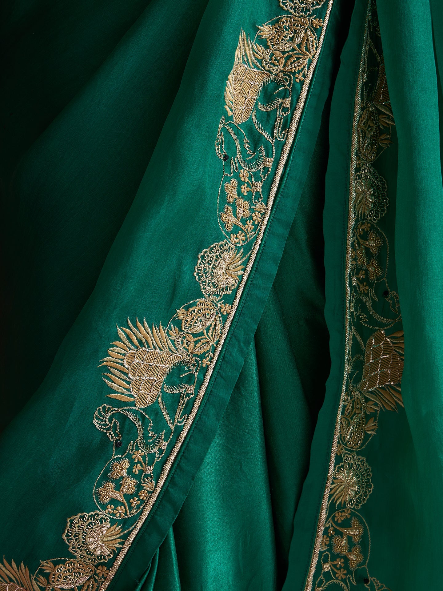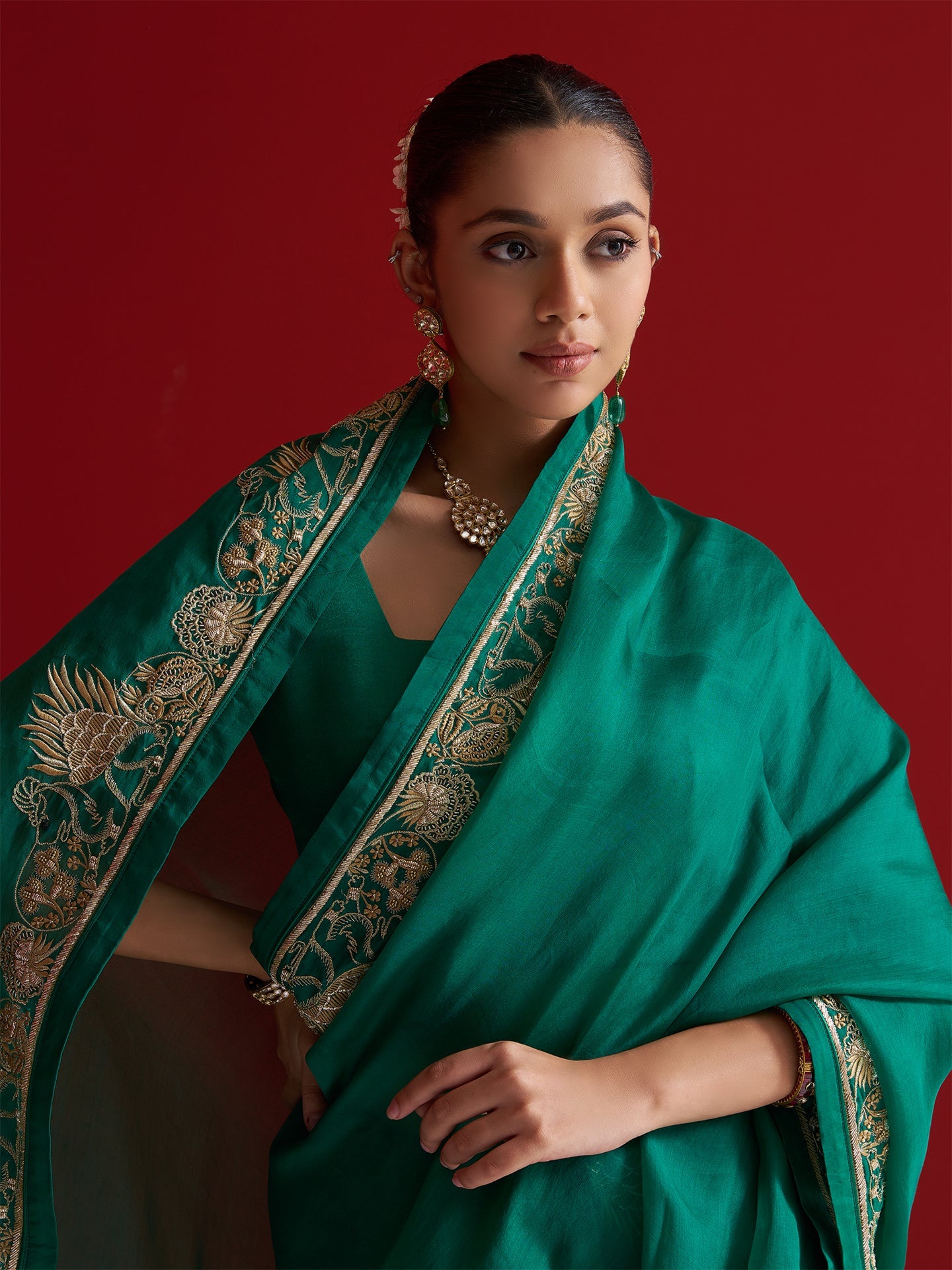 Grace meets grandeur in this striking emerald green saree, meticulously hand-embroidered along the borders with dabka, naqshi, gold zari, and silk resham. The embroidery features powerful Yali motifs-mythical guardian creatures symbolizing strength and protection, flowing gracefully along the border, making a bold statement through the traditional drape. Paired with a solid emerald blouse featuring a chic square neckline, this saree blends timeless artistry with meaningful storytelling. Saree is crafted in hand woven gajji silk and the pallu is in silk organza.