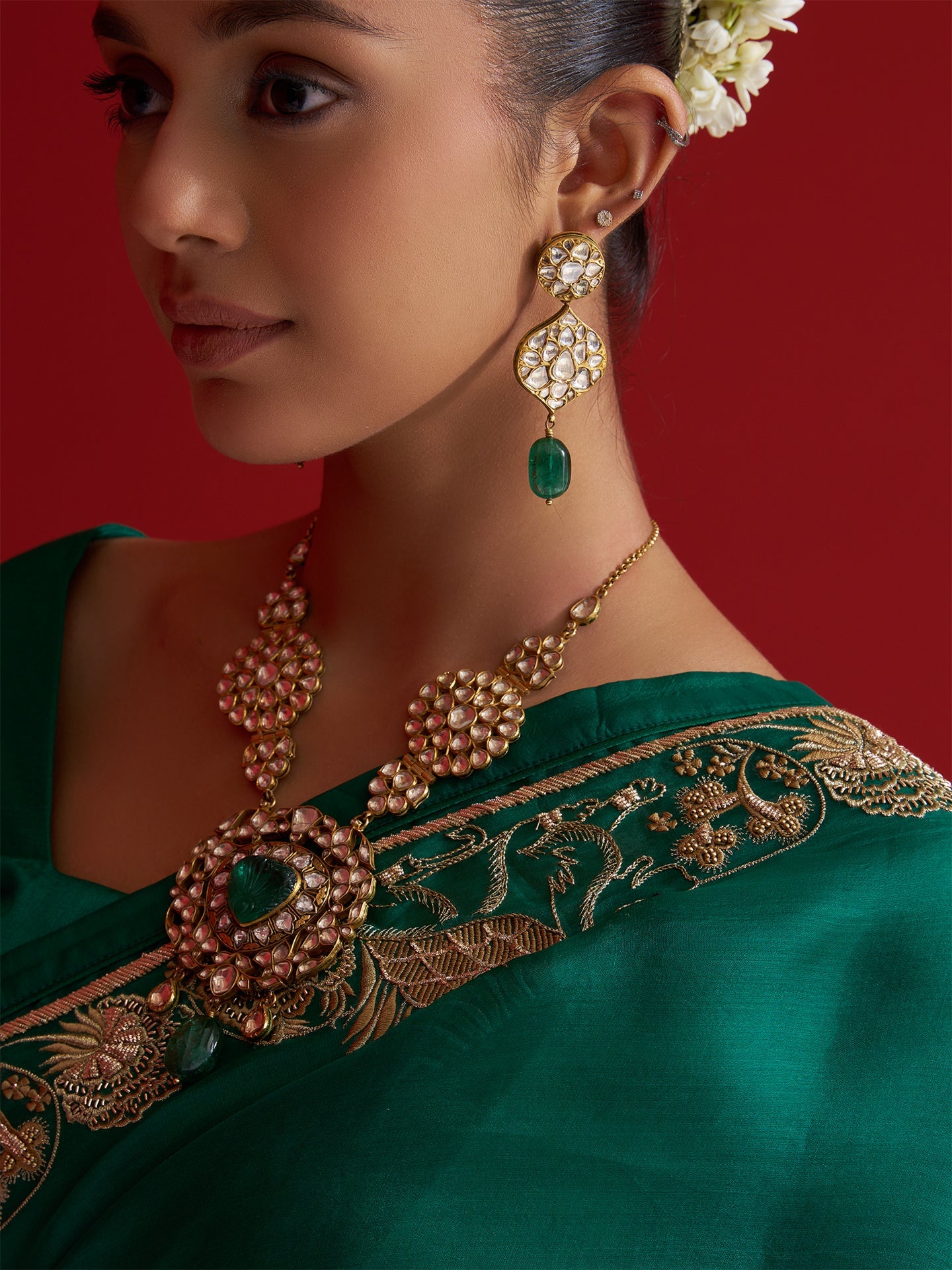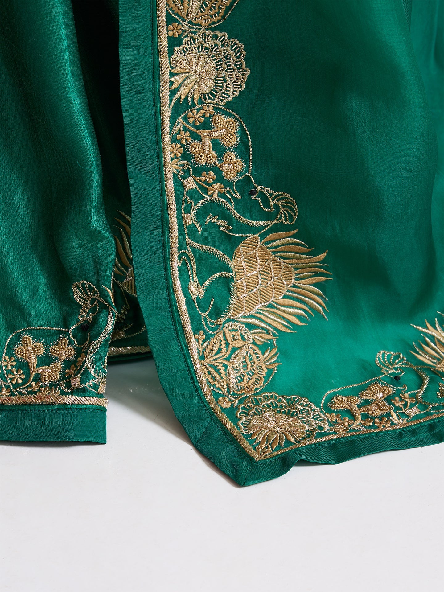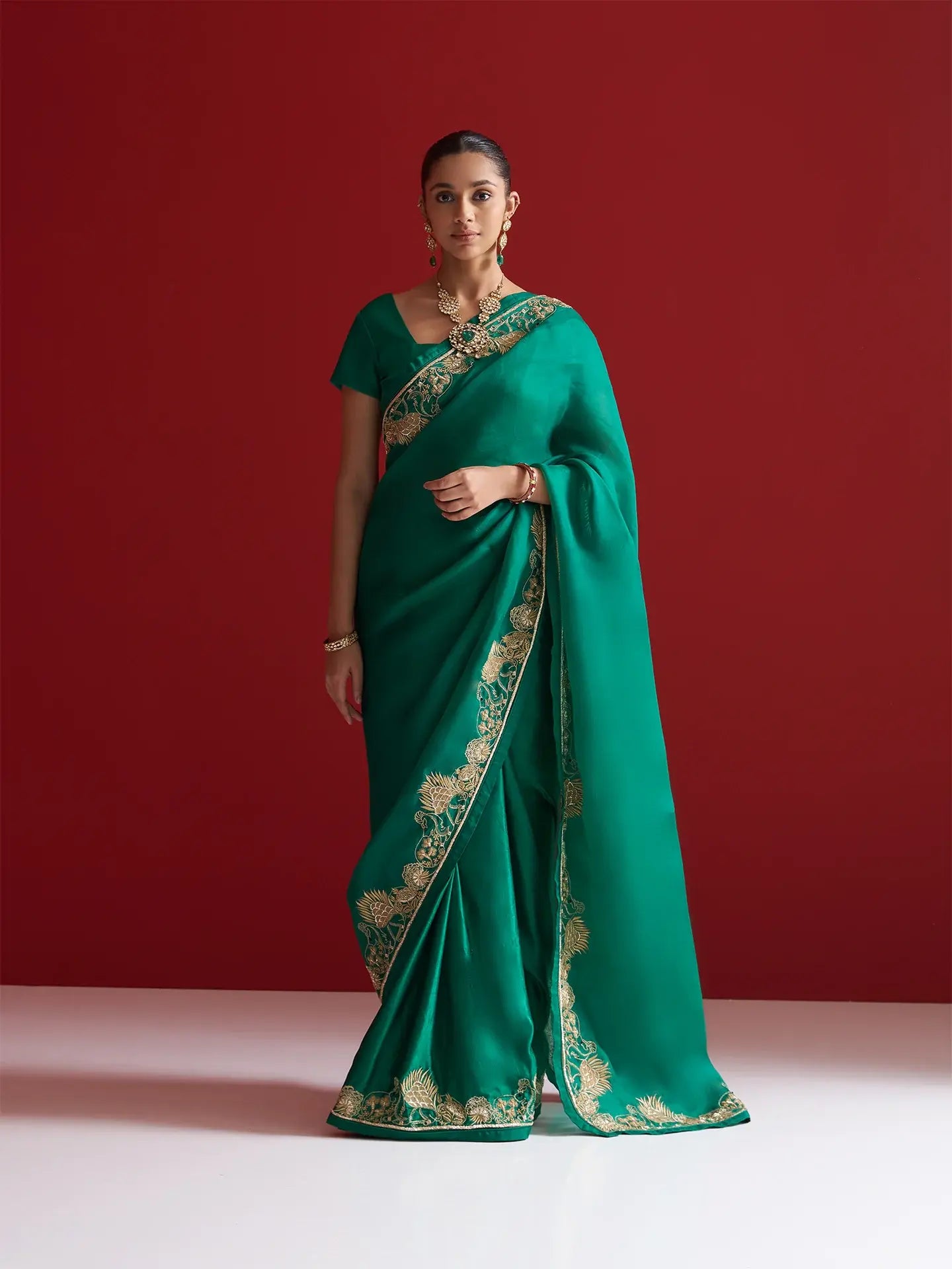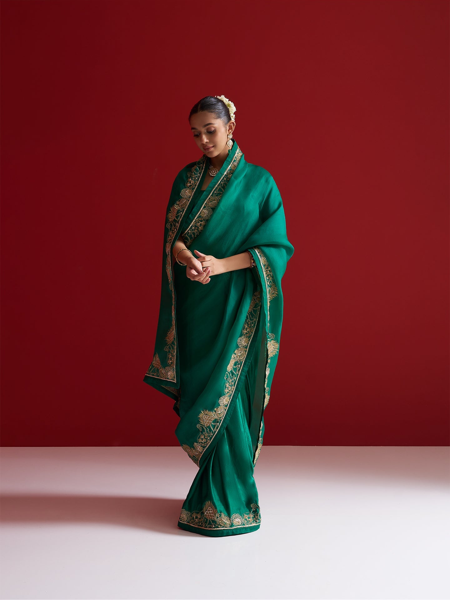 Grace meets grandeur in this striking emerald green saree, meticulously hand-embroidered along the borders with dabka, naqshi, gold zari, and silk resham. The embroidery features powerful Yali motifs-mythical guardian creatures symbolizing strength and protection, flowing gracefully along the border, making a bold statement through the traditional drape. Paired with a solid emerald blouse featuring a chic square neckline, this saree blends timeless artistry with meaningful storytelling. Saree is crafted in hand woven gajji silk and the pallu is in silk organza.