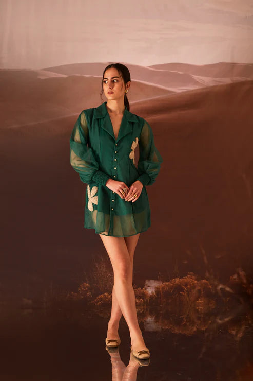 This dress is a perfect blend of art and fashion, featuring a unique combination of mesh and organza fabric adorned with hand-embroidered floral motifs. With each stitch telling a story of careful craftsmanship, this dress is sure to make a statement.
