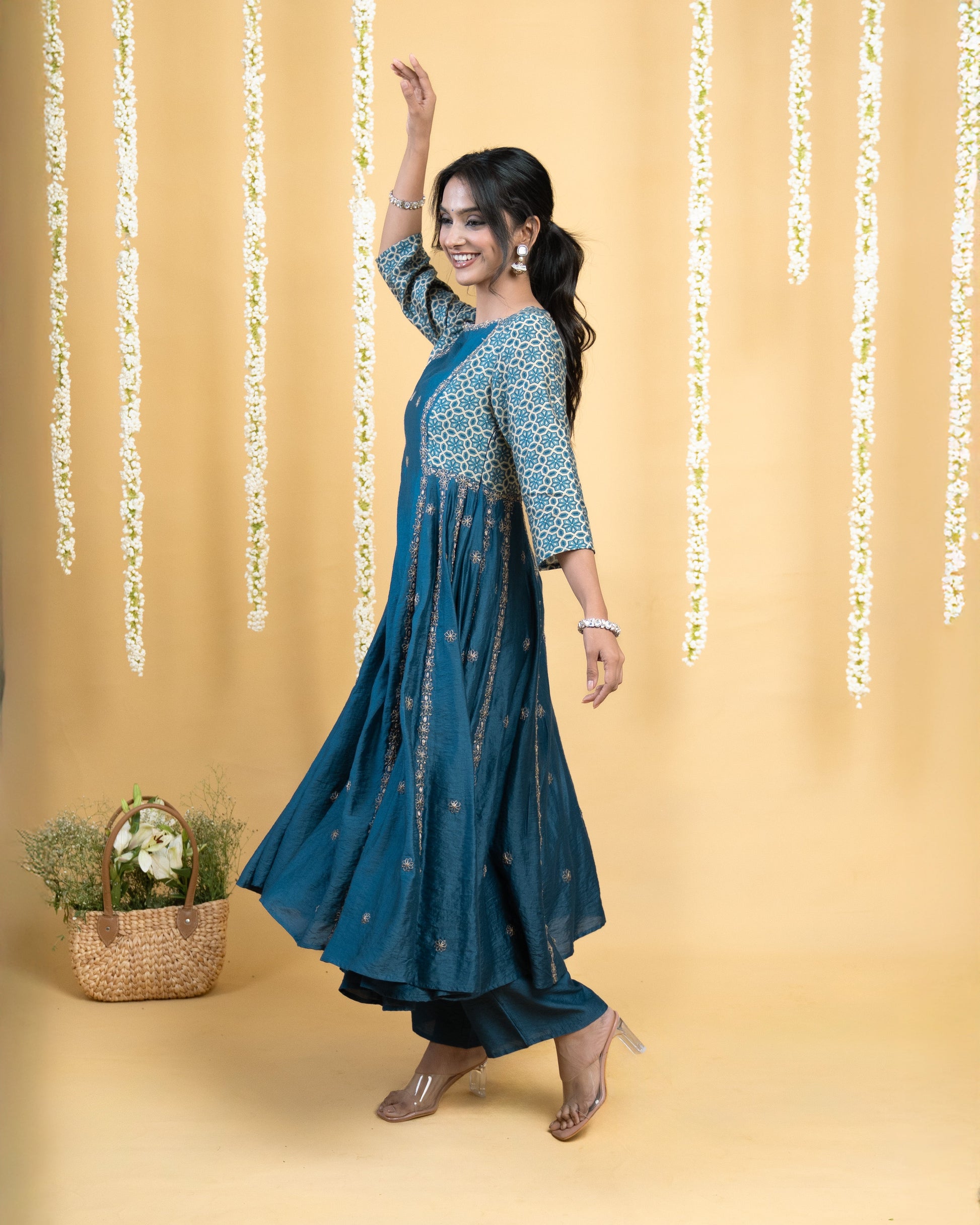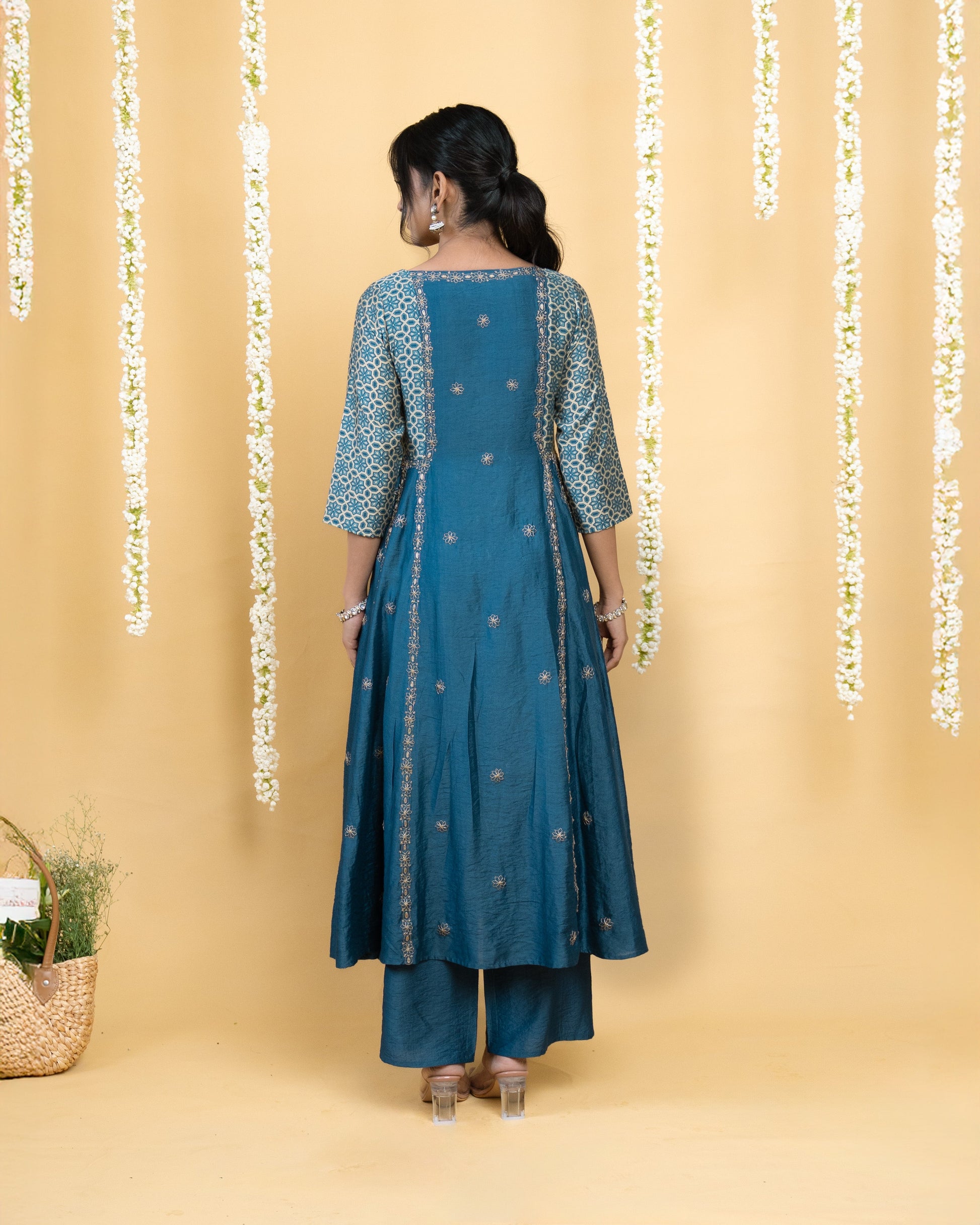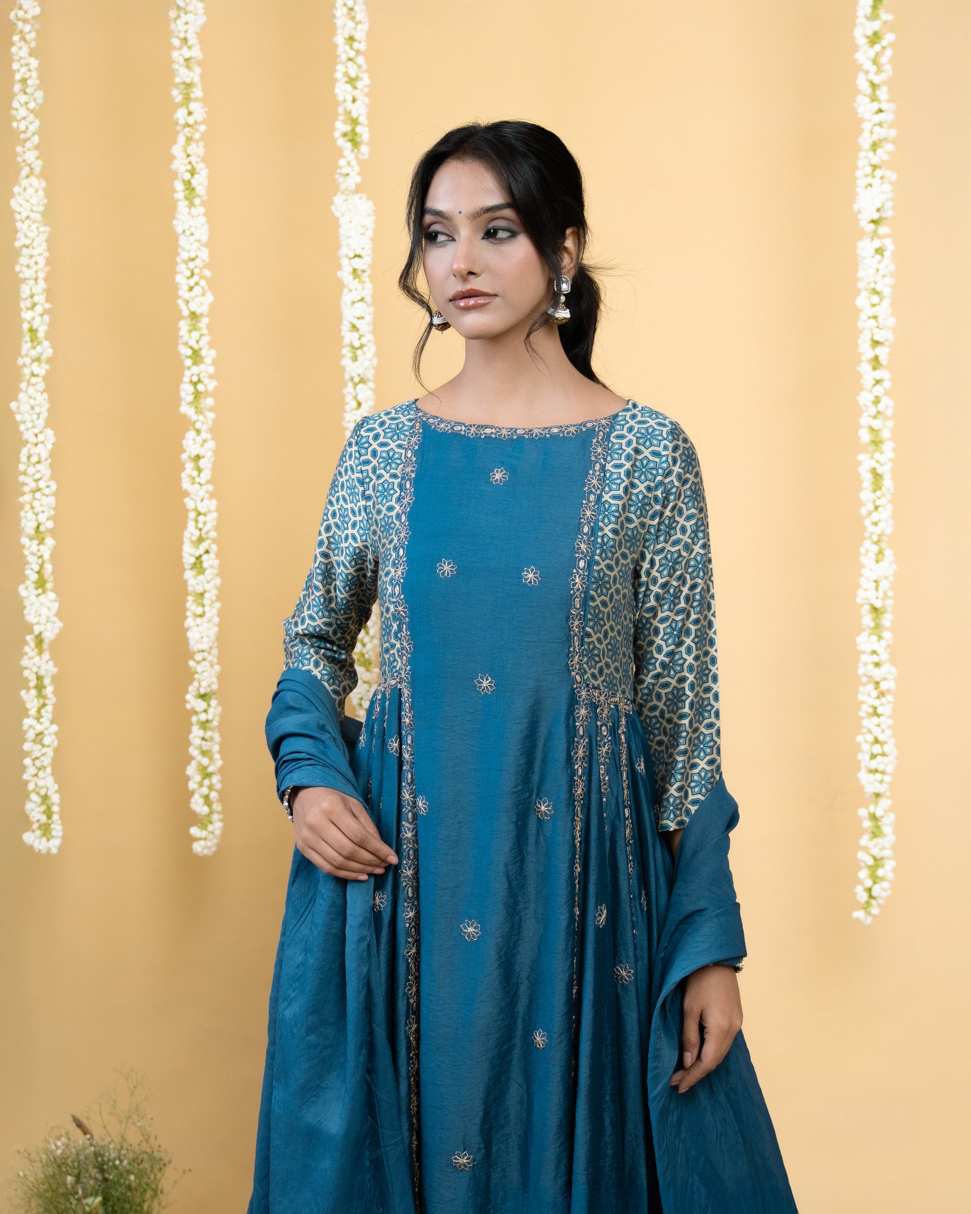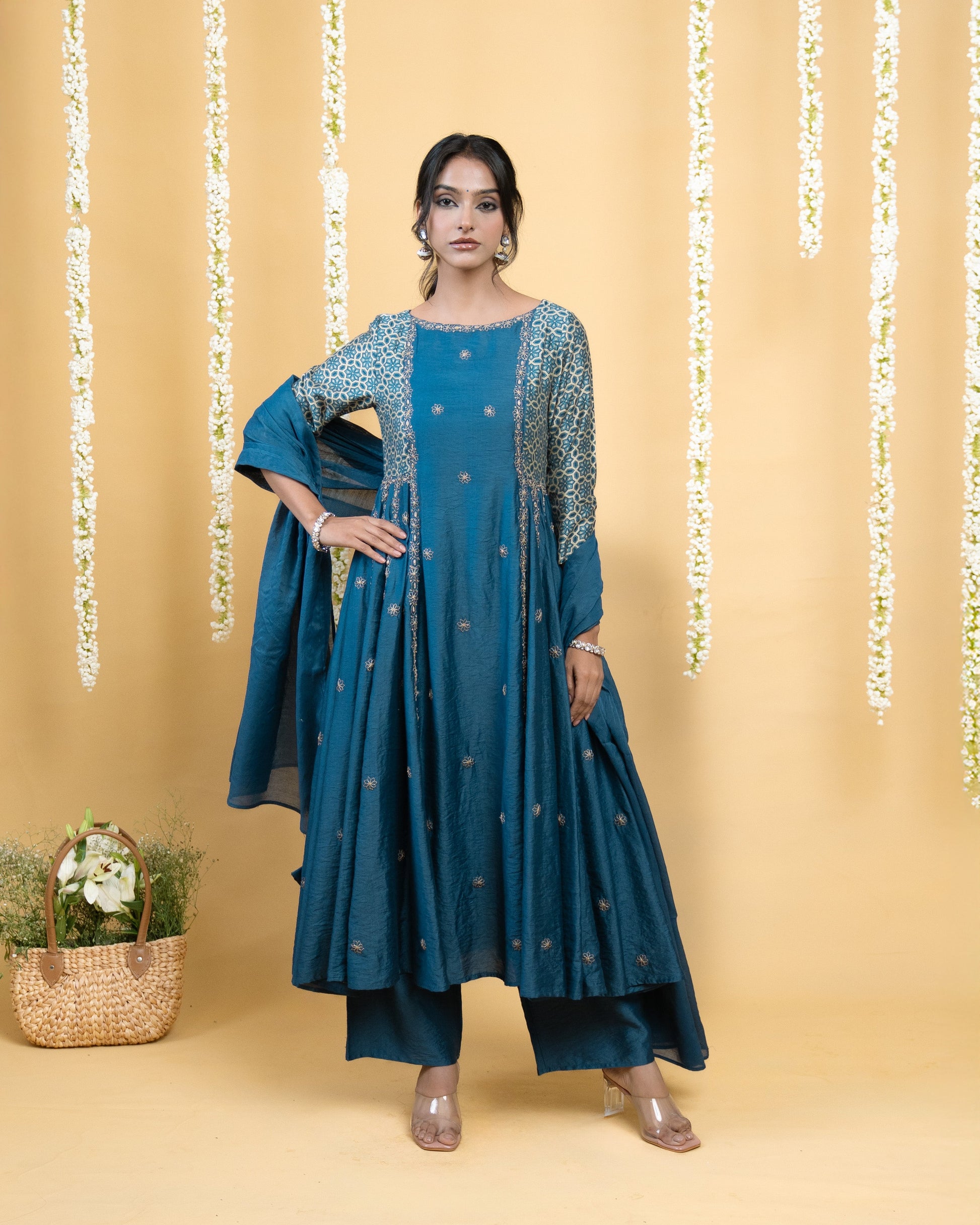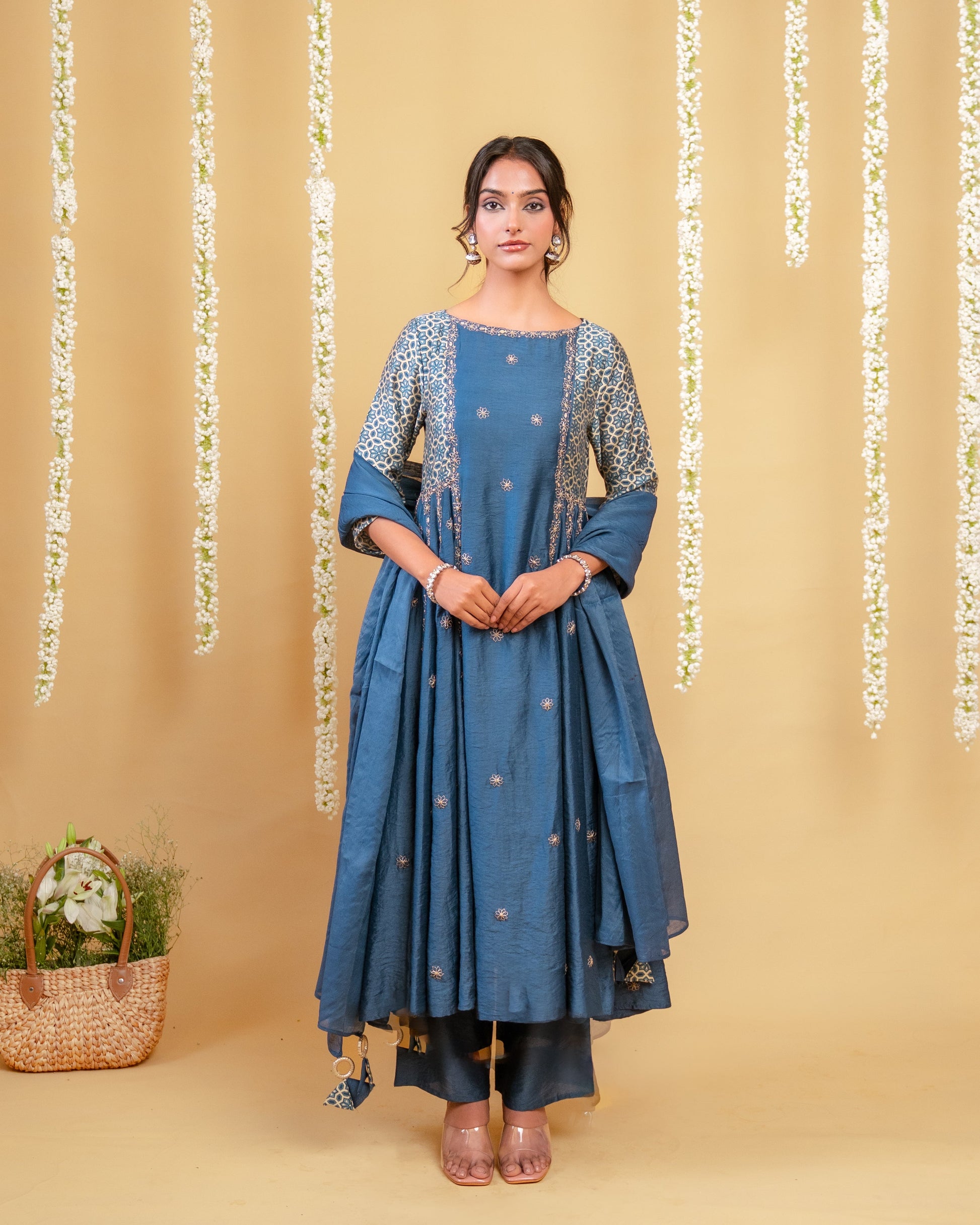Indigo-blue kurtaand dupatta set crafted in soft chanderi with delicate dori embroidered motifs. The flared kurta features printed sleeves and subtle golden accents, paired with straight pants and dupatta adorned with beautiful hand made tassels for a balanced, contemporary silhouette.