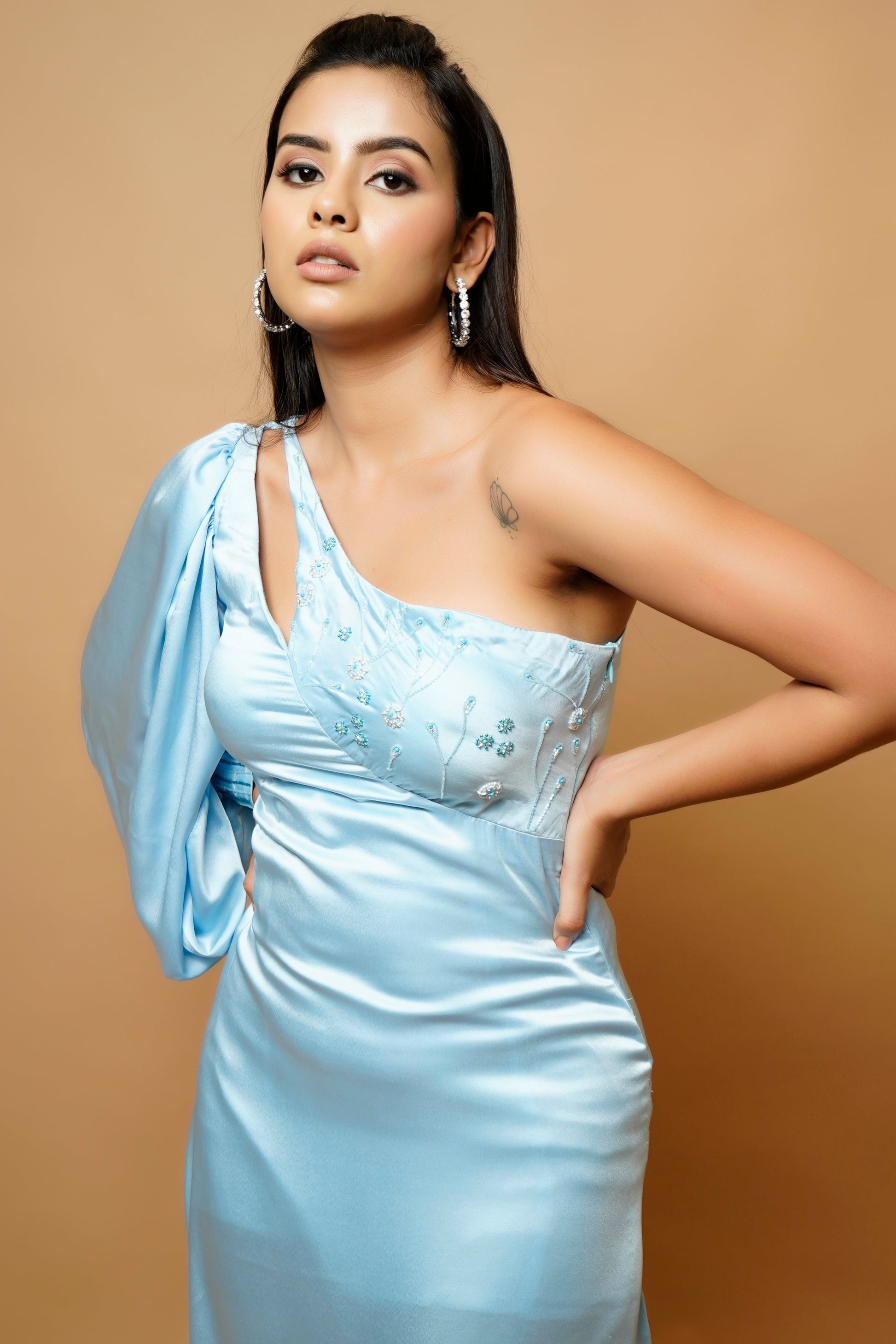 - One shoulder neckline with ballon slit sleeve
