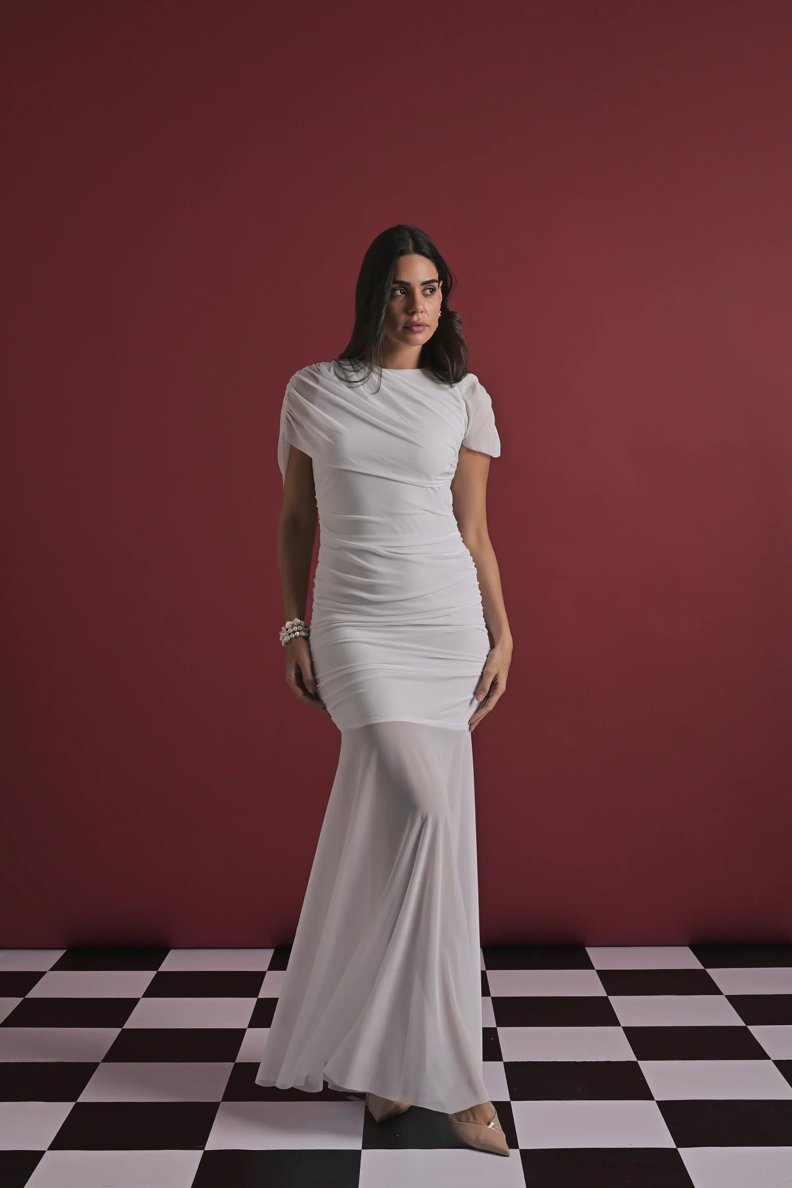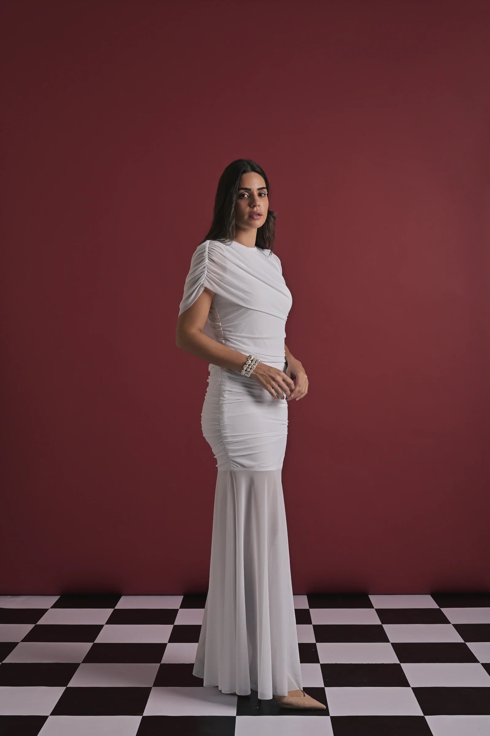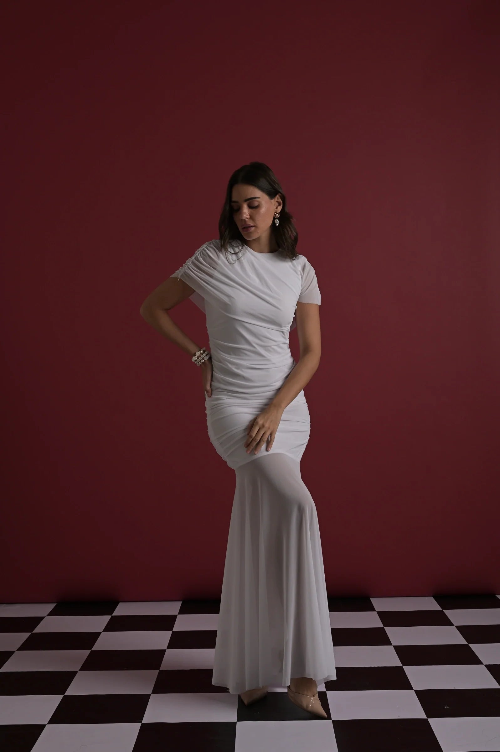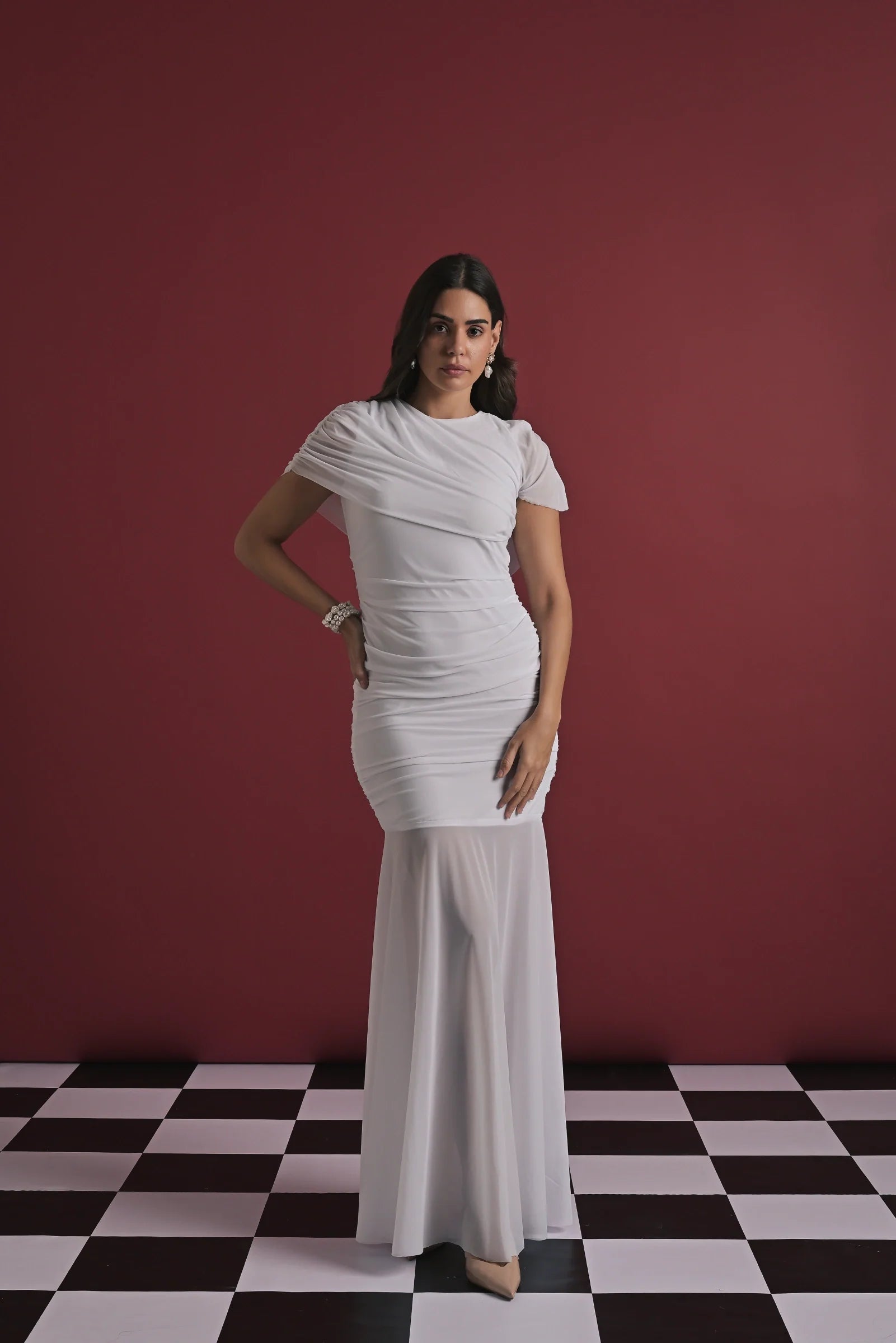 A sleek and modern white bodycon dress crafted in premium lycra for a smooth, sculpted fit. The dress features short sleeves and a flattering silhouette that flows into a net mermaid hem, adding movement and an elegant sheer detail. Designed to accentuate your shape while keeping you comfortable, this piece is perfect for evening events, celebrations, or elevated day looks.