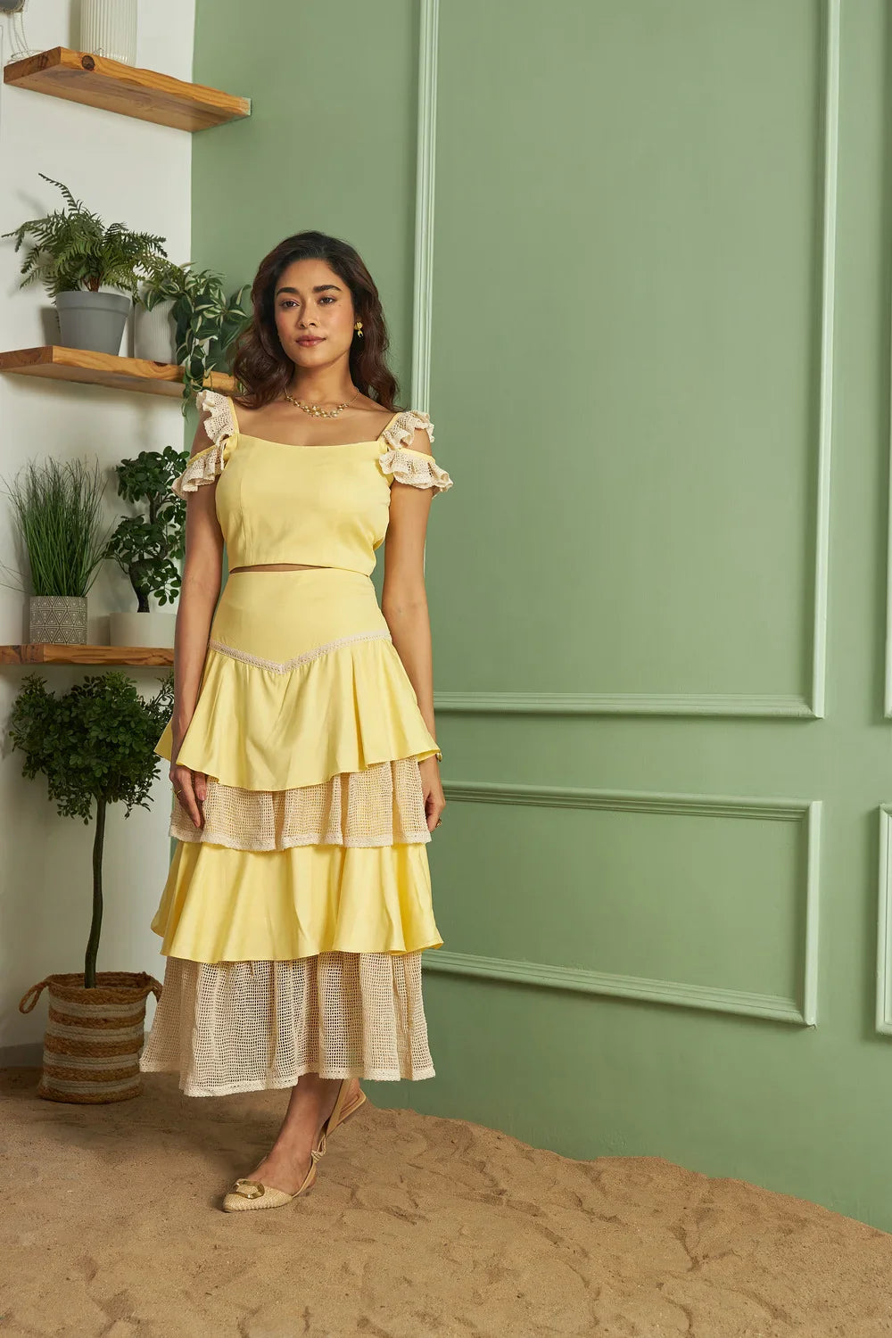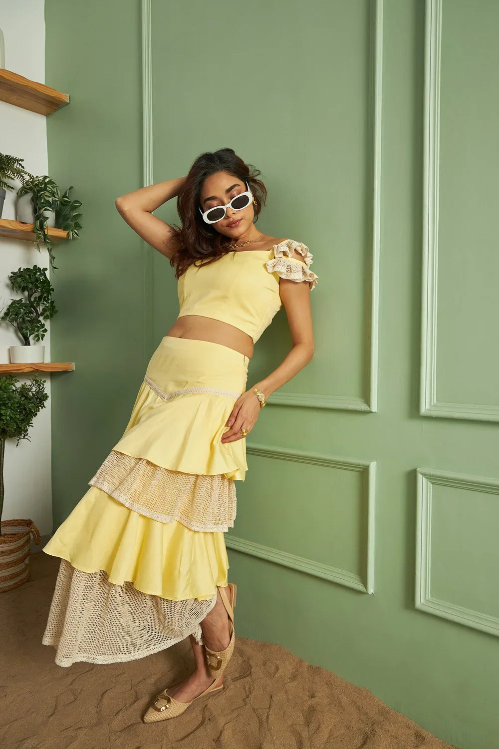 An off-shoulder crop top with a layered skirt of solid fabric and mesh crochet fabric with frills of crochet fabric on straps for highlights