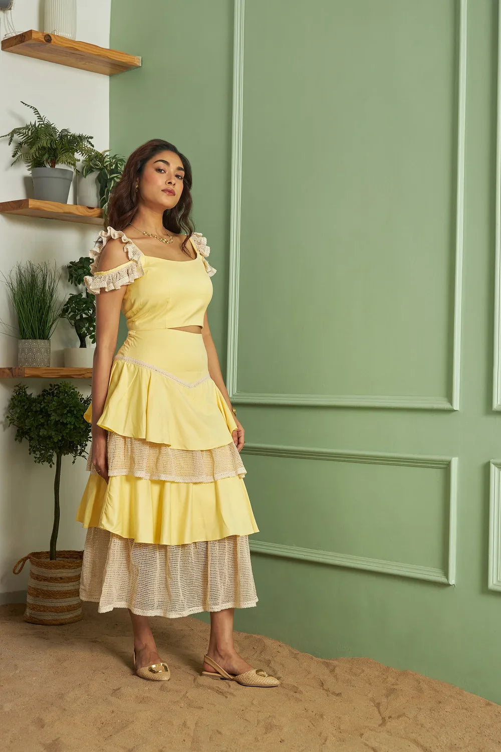An off shoulder crop top with layered skirt of solid fabric and mesh crochet fabric with frills of crochet fabric on straps for highlights