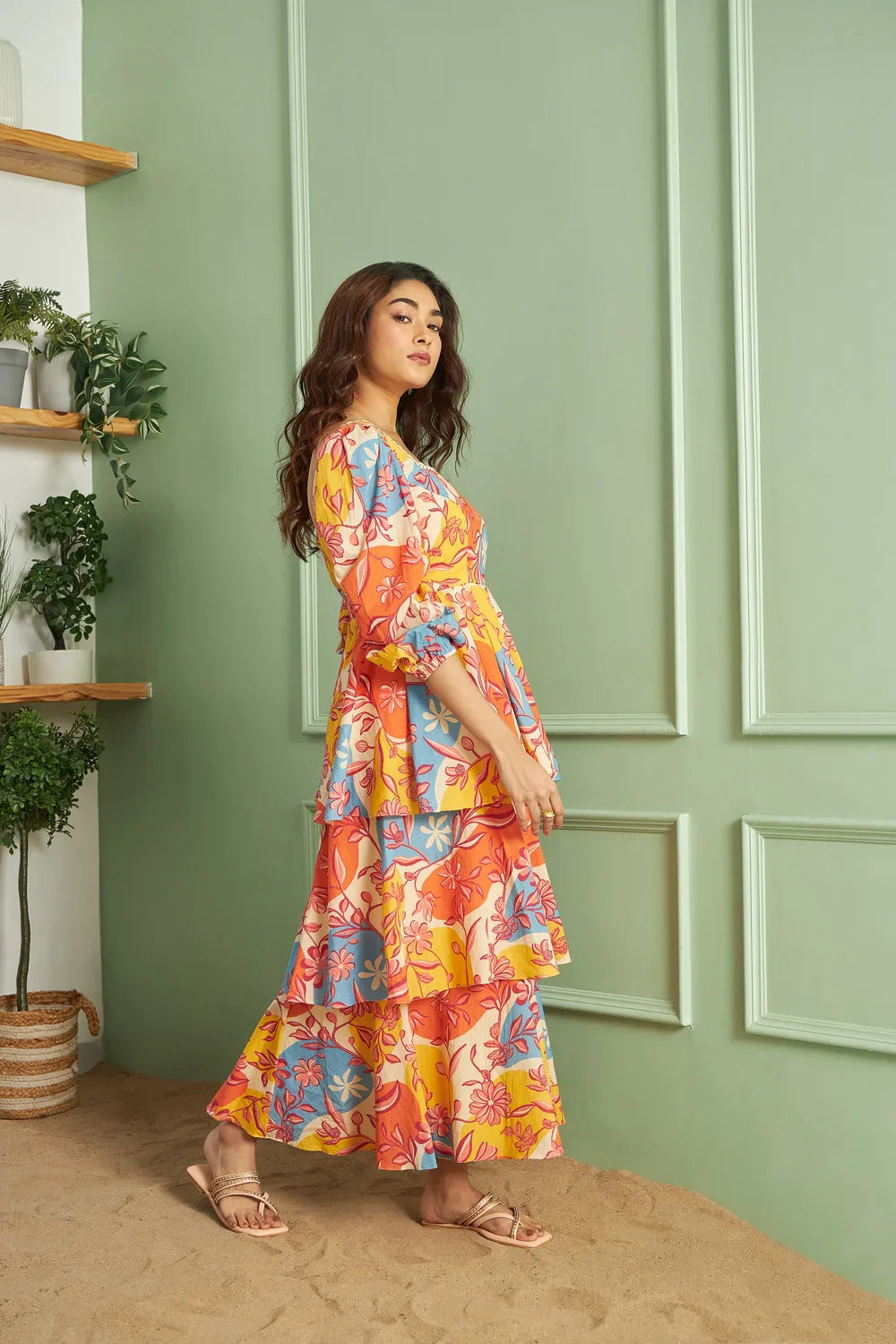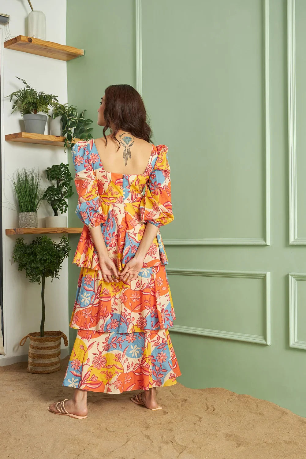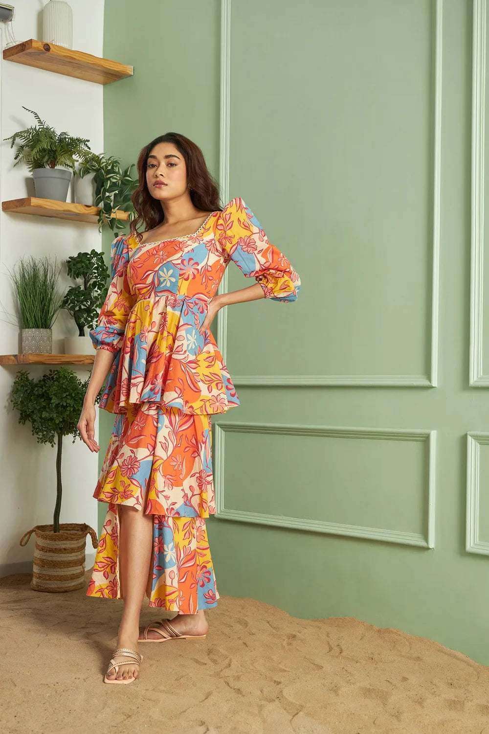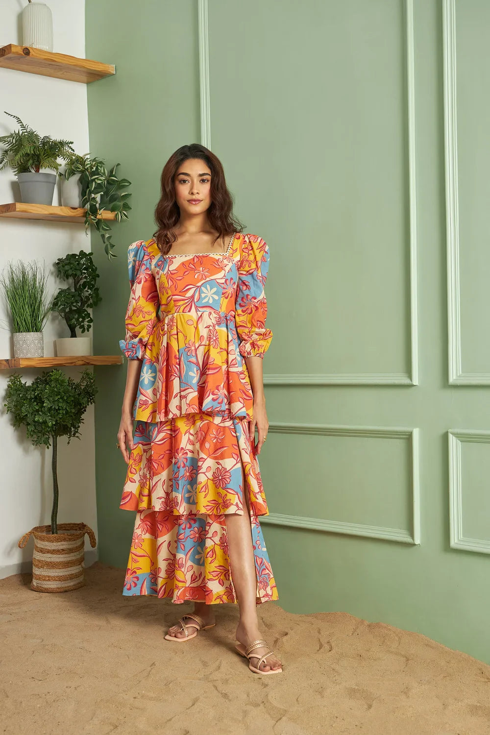 Three layer dress with front slit and puffy sleeves with small lace detailing on neckline for highlights. side zip