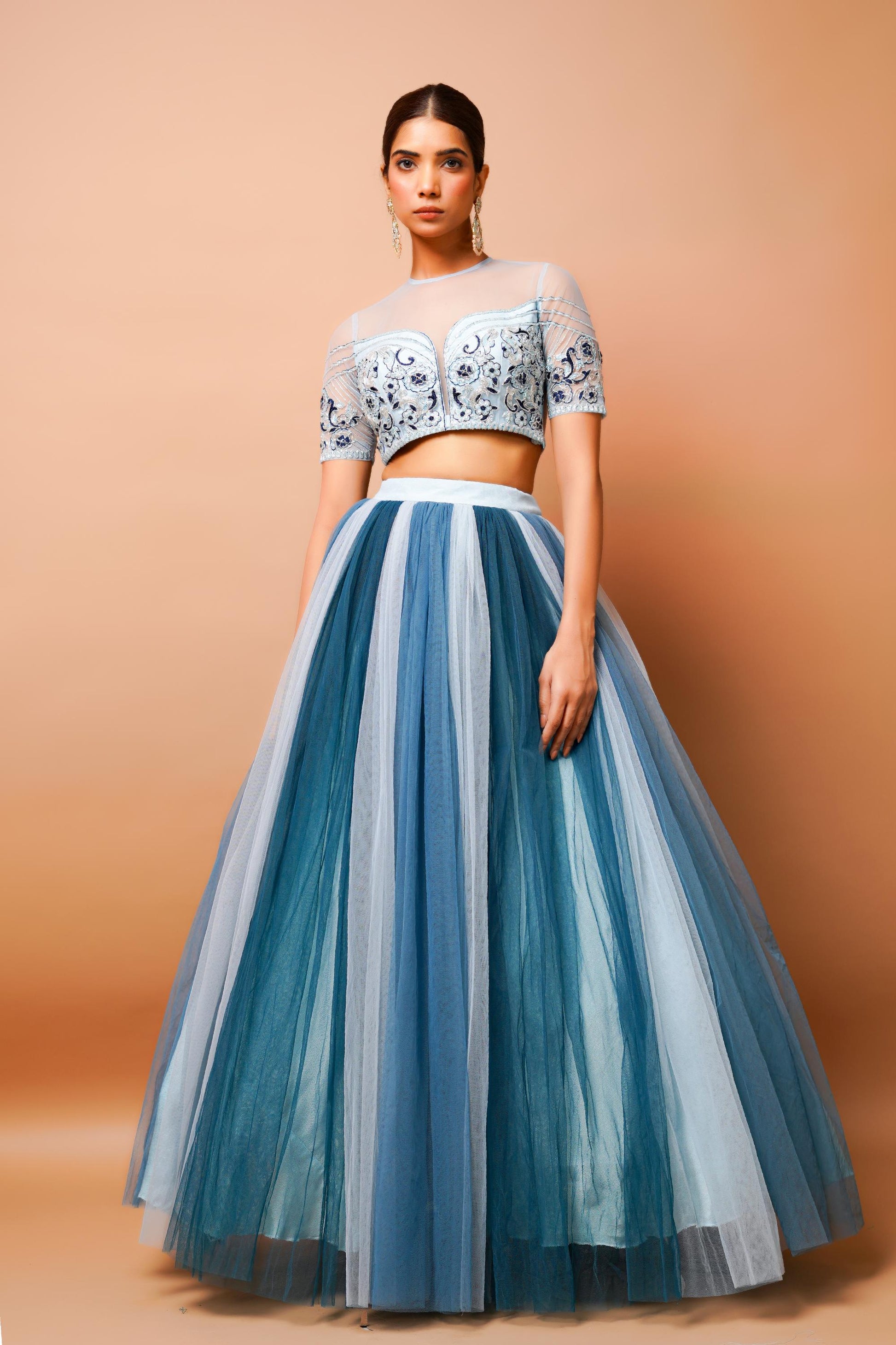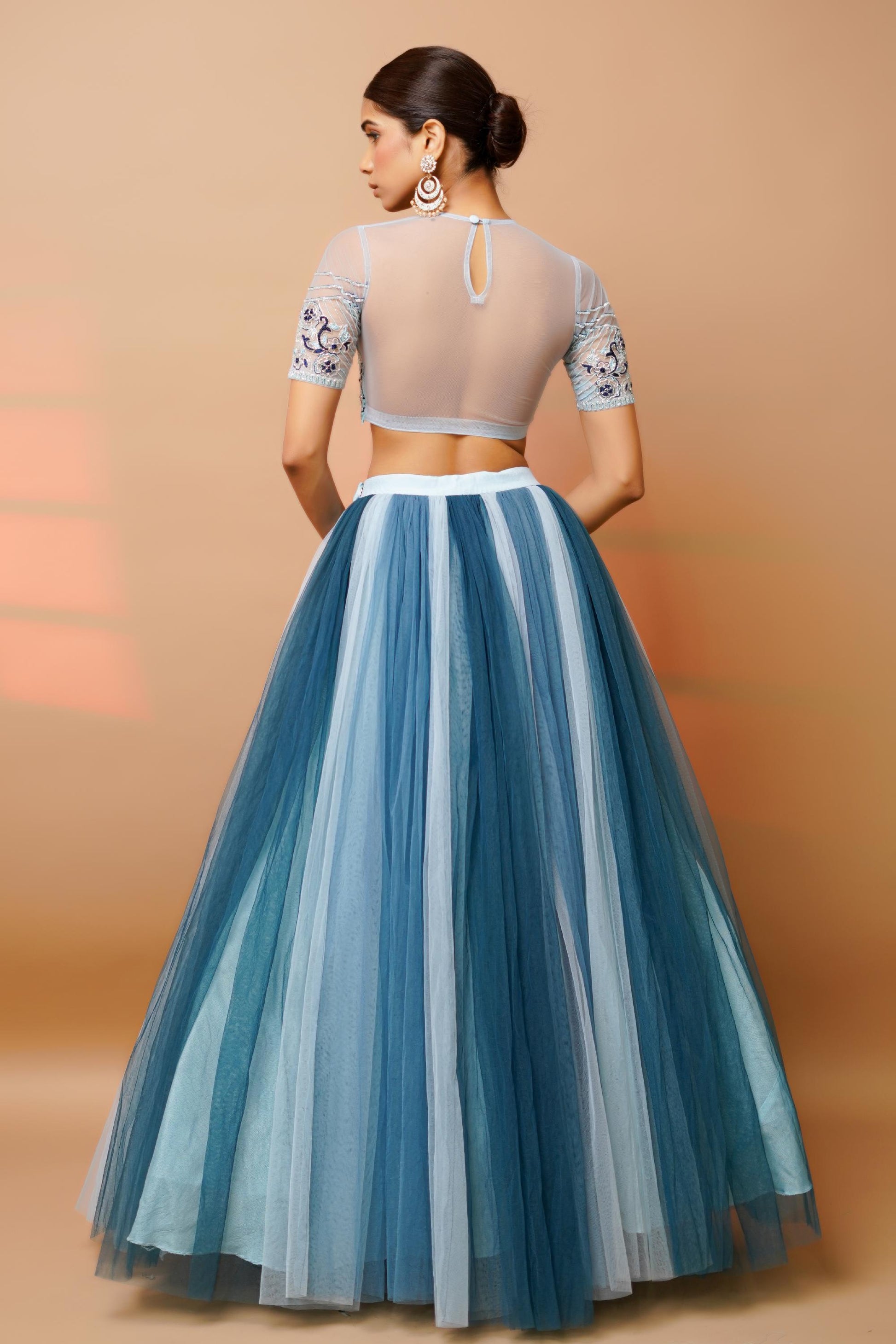 - This set comes with a semi transparent padded blouse with floral embellishment .